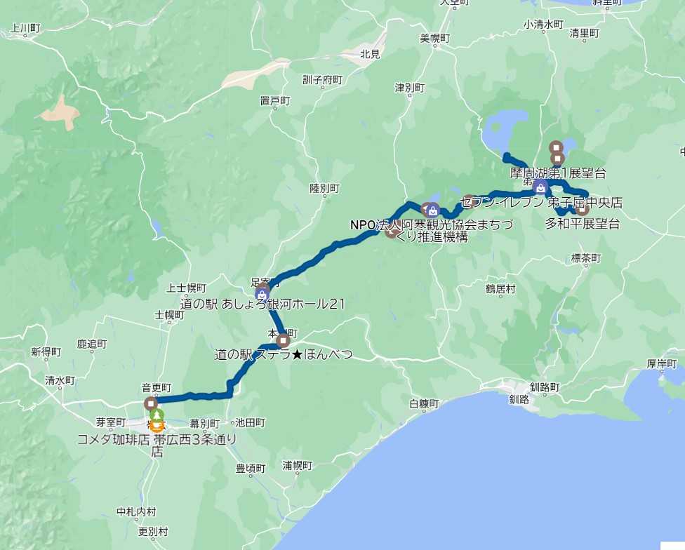 良く寝たなんだろう橋摩周第一展望台摩周第三展望台多和平展望台双岳台阿寒湖観光協会阿寒湖エコミュージアムセンターボッケ阿寒湖アイヌコタンオンネトー湖野中温泉道の駅あしょろ銀河ホール21ツルハドラッグ道の駅おとふけコメダ珈琲