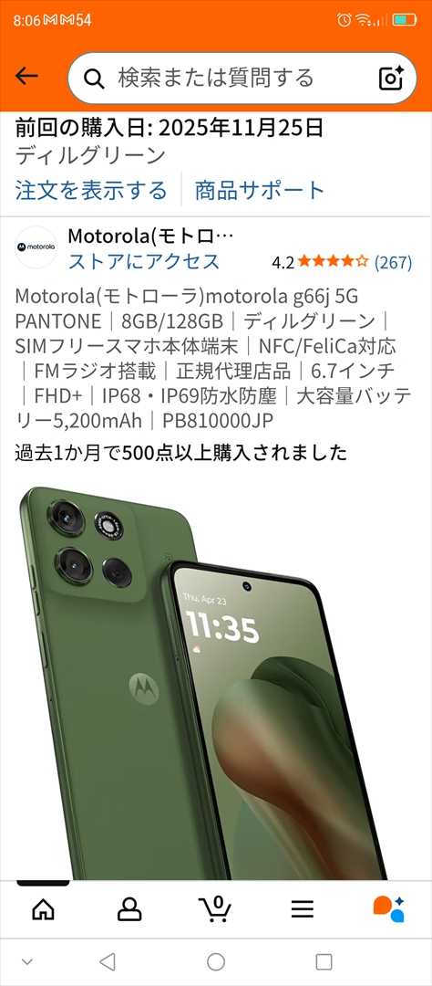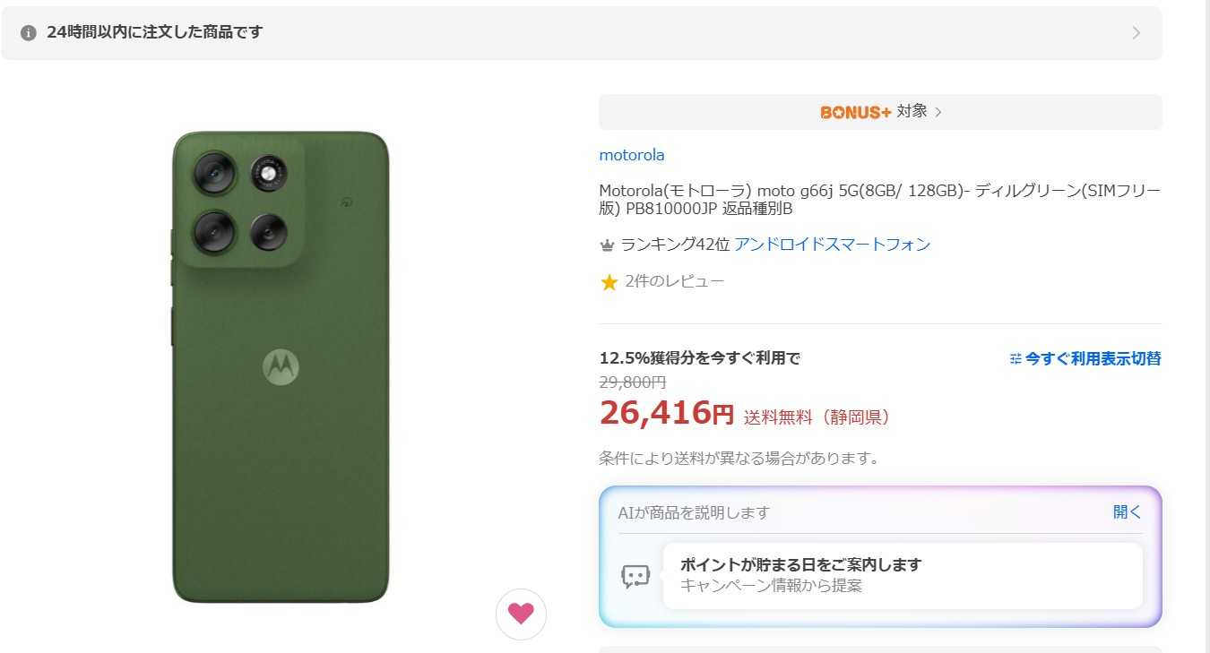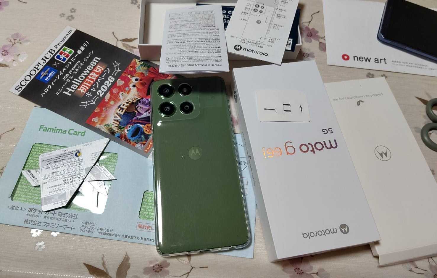 ほぼテザリング専用スマホRakuten BIGバッテリーがヘタってきたので買い替えることにしたこんどは初めてのmotorolaだmotorola g66j 5Gはまぁまぁらしくてサブとして使うにはいいと思った変わった色のほうが目立っていいなとグリーンにしてみた貯まってた5007ポイント使った