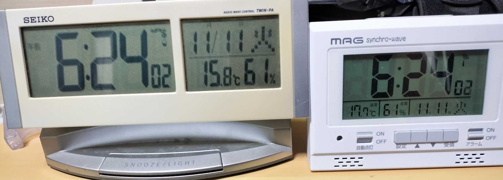電池が少なくなったようで液晶が薄くなった電池交換いつものことだが電波を受信しなくて苦労する鉄筋コンクリートのせいか電波掴みにくいみたい手動でやる方法もあるけどそれは面白くないwなんとしても電波掴ませたいということで家の中をぐるぐる結局、今ある電波時計の隣に置いたらあっけなく掴んだなぜか家の真ん中あたりなのに電波が届いてるようで必ず受信できる窓際では掴まないくせに なんでやねん と思う