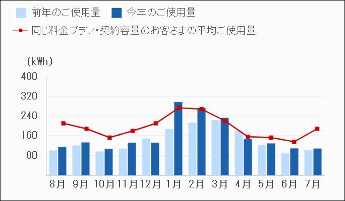 なお、電気使用量グラフにつきましては、同じ料金プラン・契約容量のお客さまの平均ご使用量と比較することも可能ですので、ご参考にしていただければ存じます。