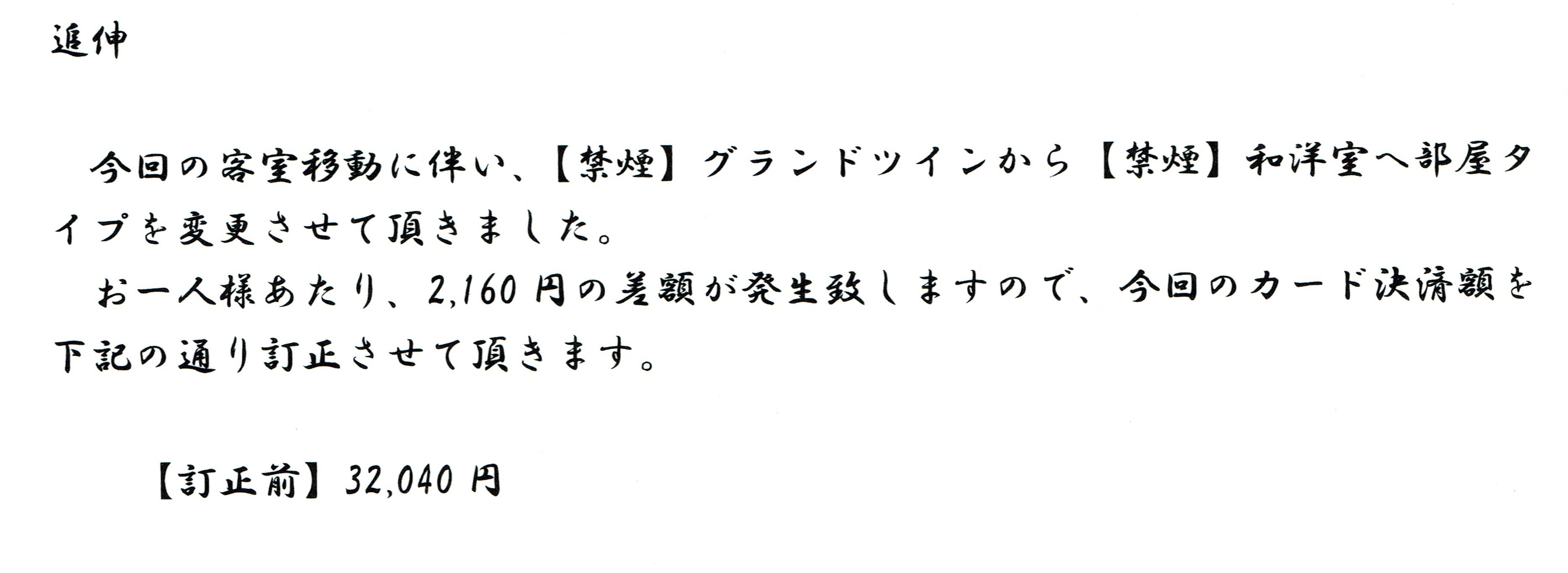 お部屋のグレードが下がるのでひとり2160円合計4320円を返却してもらうこととなった。
