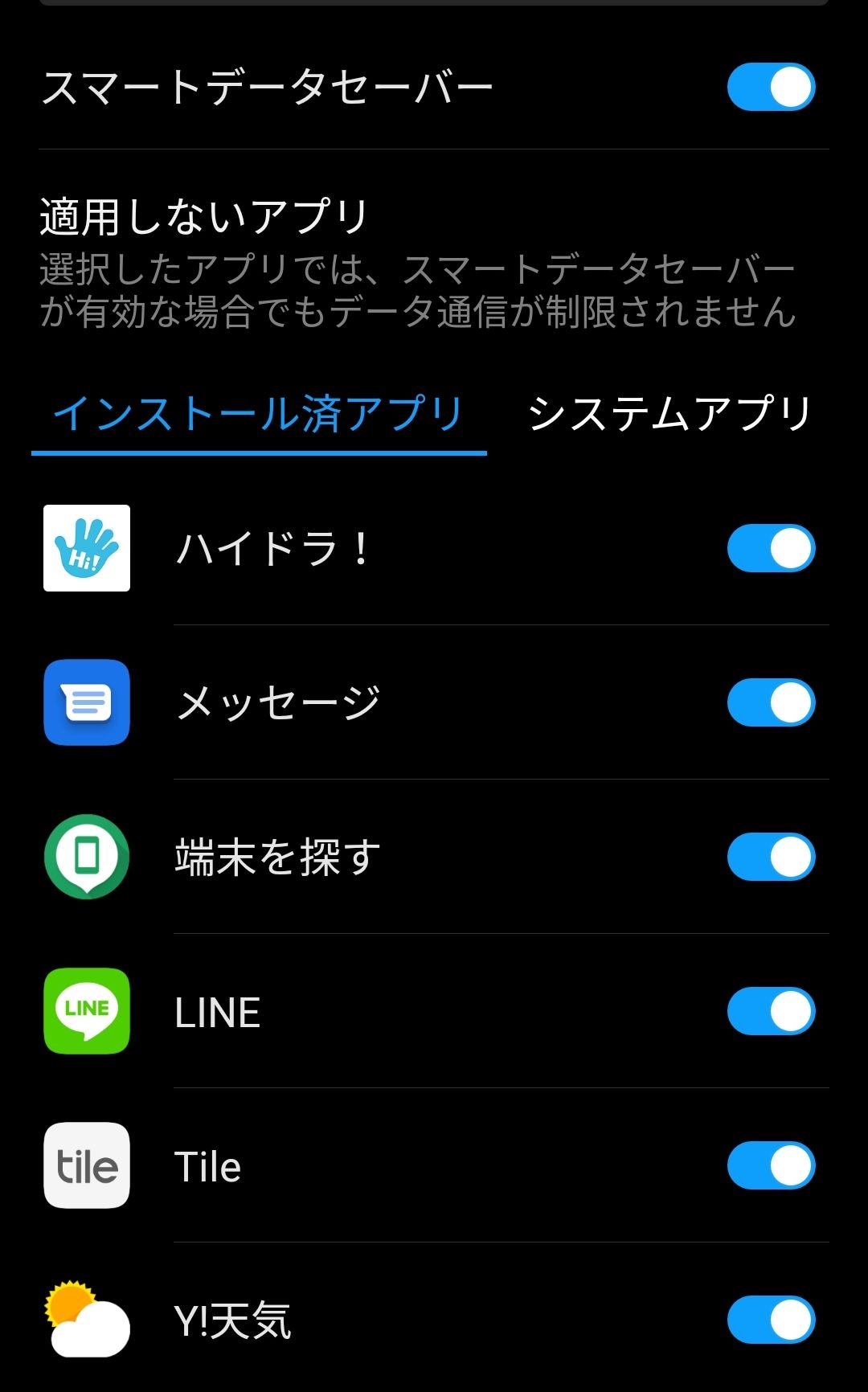 あとはHUAWEI Mate 10 Proの設定でバックグラウンドでも通信可にして、普段はデータセーバーONで余計なアプリの通信をカットしてるけどtileは制限されない設定にしてと。