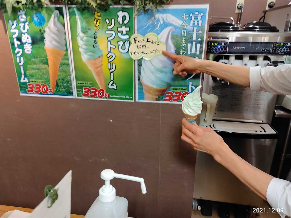 全部わさびソフトと上半分がわさびソフトで下は甘いソフトクリーム