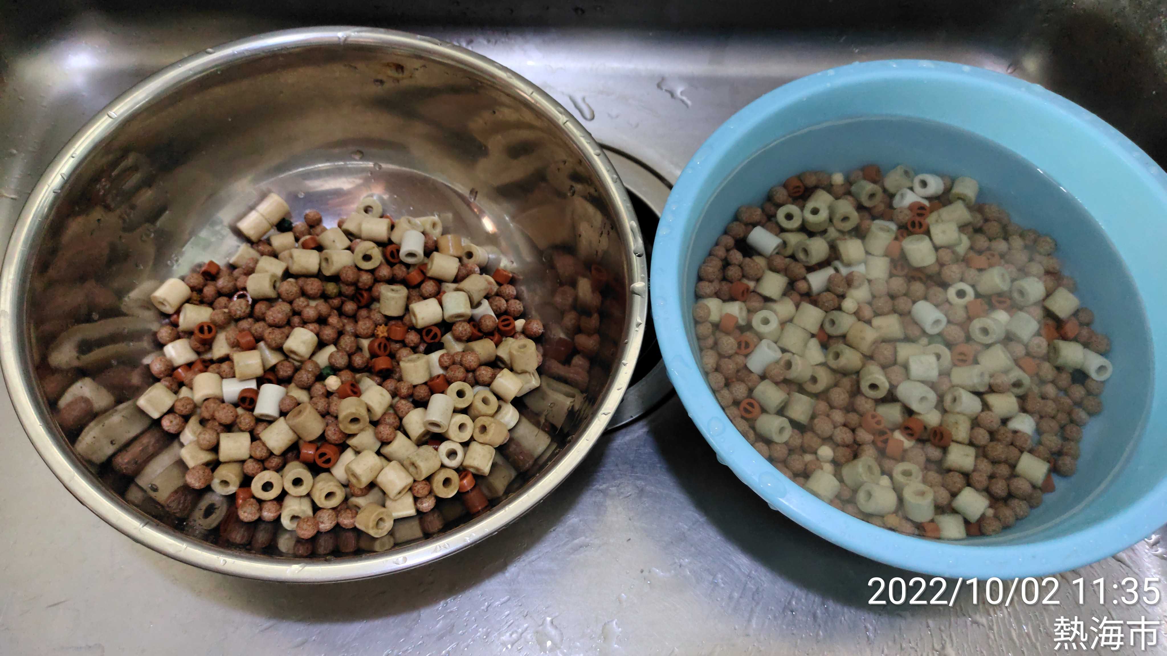 そして熱湯消毒してバクテリアのいないろ過石はよ~く濯いで1階の上部ろ過器にセットだ