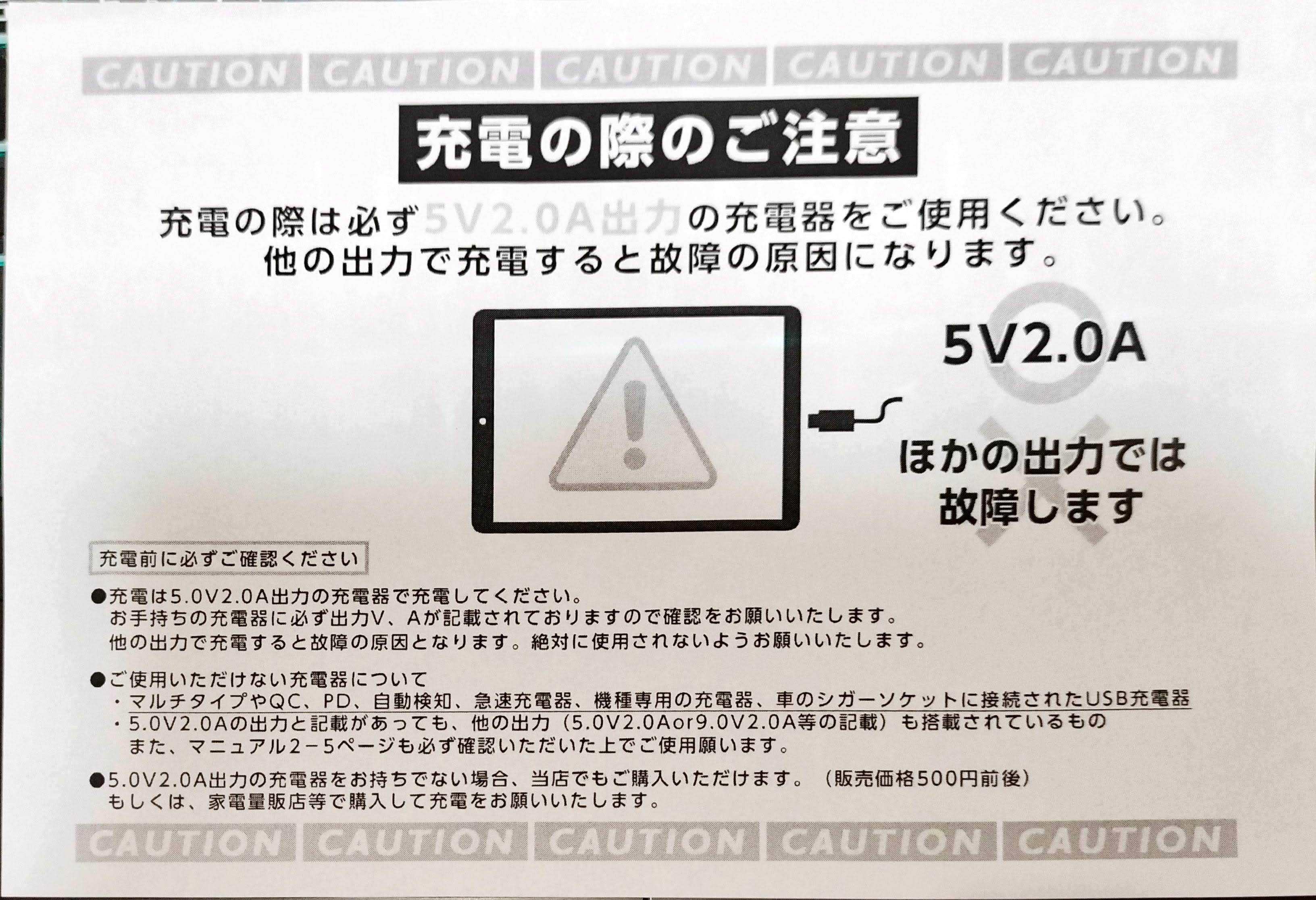 充電器は5V2.0A以上のものでないと故障します と書かれてる