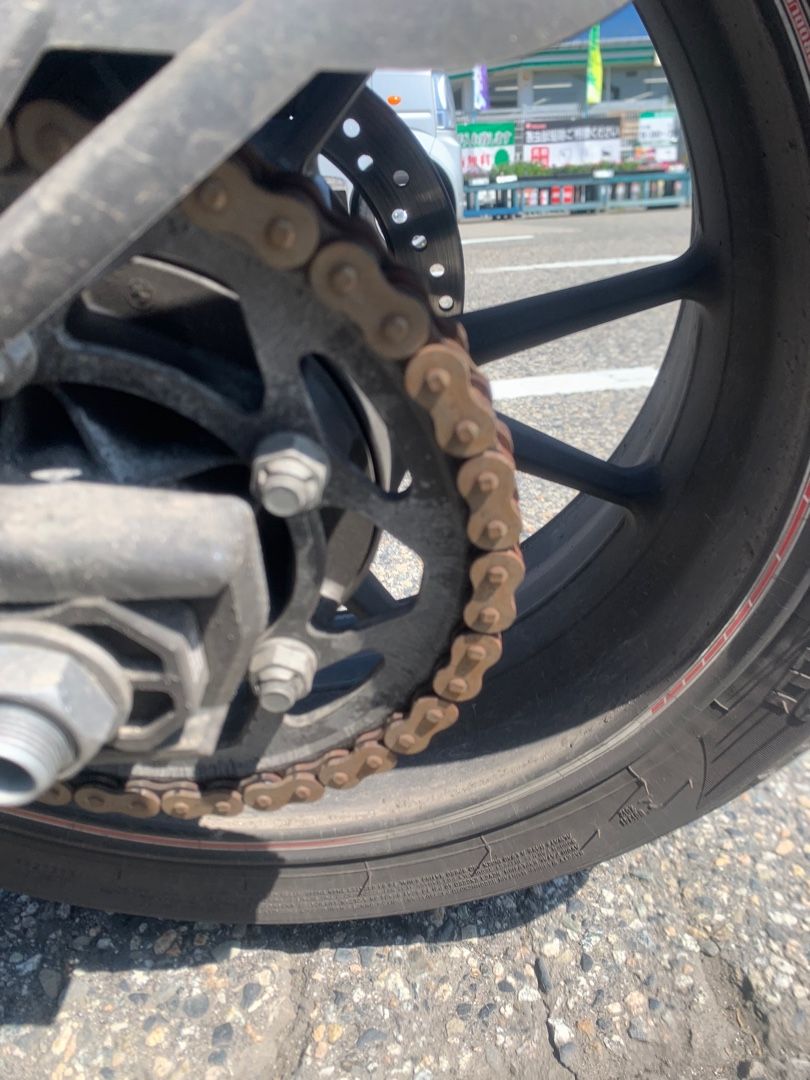 去年のゴールデンウィークに東北一周ツーリング行きました確か2000㎞以上走りましたほとんど雨、青森津軽辺りは台風並みの暴風雨東北はゴールデンウィークでも道路には融雪剤が残っていましたおかげでチェーンが錆びてしまいました急いでホームセンターでチェーンルブ購入ほぼ焼石に水でしたね。汚れや錆びの上からルブ吹き付けてもはじいてしまい、やらないよりマシな程度帰ってチェーン清掃してみたら奇麗になったんですがもうトータル15,000㎞走ってオイル切らして走ったのだからやっぱり伸びていました。あきらめて交換です。前後スプロケットも交換です。スプロケットナットも交換です。スプロッケットはサンスターチェーンはRKのブラックバイクを押すと軽くなったし、音も静かでカッコいいけど…なんせ高い消耗品ですが寿命より早く交換するはめになったのは雨の中無給油で2,000㎞程走ってしまったからです。距離を走るとランニングコストがかかりますが余計な出費ですよね💦チェーンは大事です チェーンルブ ワコーズ CHL 98210 これは小さくて持ち運びに便利、旅先でも使えそう水置換なのでぬれていても大丈夫