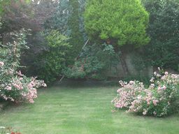 お盆のお休みを利用して、主人がお庭の芝刈りをしてくれました。修景用の淡いピンクのばらがふんわり芝生にかかって、いい感じです。