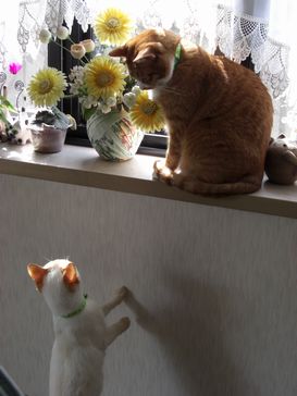 ミル見習いさんは昨日のニャンコフラワー教室をさぼってしまいましたグーグーお昼寝をして夕方目がさめましたミル:「まずいでチュ・・お稽古おわっちゃったでチュ」そして夜 夕飯をかたずけた後のテーブルを見ると・・ミル:「横のお花をさす位置はこのへんで・・・・」モア:「縦のお花の位置は?」ミル:「ええっと・・・このへんでチュか?」モア先生の居残りレッスンが続いています