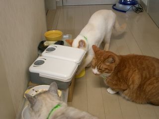 今年は久々にゴールデンウィークが続けてお休みできそうなので旅行に行く予定です問題はニャンズいつもは近くに住む実家の母が面倒を見に来てくれるんですが・・・・今回は「弟の選挙」のため、専業主婦の母も毎日あいさつ回りでフル回転している旅行に行くだけでも片身が狭いのにさらにニャンコの世話を毎日頼むのは・・・・考えた結果、すこしでも母の負担を減らせたらと「自動給餌機」を購入しましたニャンズにも慣れてもらうため、昨日早速使ってみました2食分タイマーでセットできるタイプカリカリを両方にいれて時間をづらして開くようにセットビッケ:「ここからカリカリのにおいがするぞ!!」ミル:「なんでふたがしまっているんでチュか?ままが開けるの忘れたのかニャ?」ミル:「じゃあミルちゃんがあけてあげるでチュ よいチョ よいチョ」ビッケ:「なかなか開かないな~」2人のガサガサしている音を聞きつけモアちゃんも登場モア:「何しているの?」ビッケ:「この中にカリカリがはいっているのに フタがしまっているんだ」ミル:「こっちのすき間から見えるかな~エイエイ」このあとしばらく3匹でフタをあけようと格闘していました3匹集まれば文殊の杖・・・とも言うし??開けたらどうしようというか壊されたら困る!!そんな不安を残しながらも外出帰宅して見るとちゃんと開いて(こじ開けたんじゃないよね?)たべたみたい実はかなりタイマー音が大きくてニャンズが警戒して食べないかと心配してたんだけど「食い気」のほうが勝ったみたいです