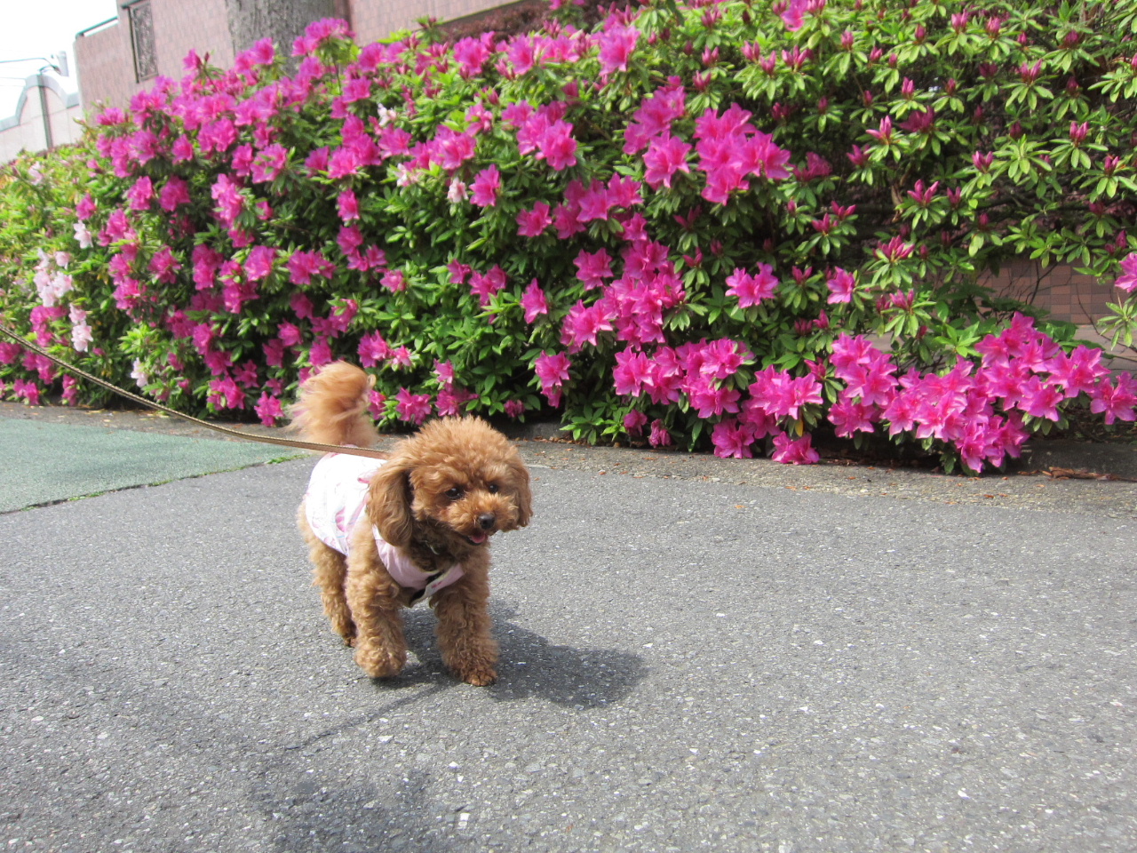 火曜のお昼のお散歩です。もものお散歩コースのツツジが咲いてきました。これが満開になると、とてもキレイです。