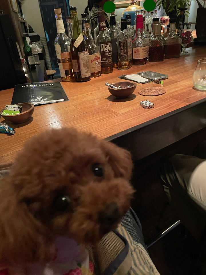 もも:カウンターの中にわんこがいますわん。遊びたいわん。