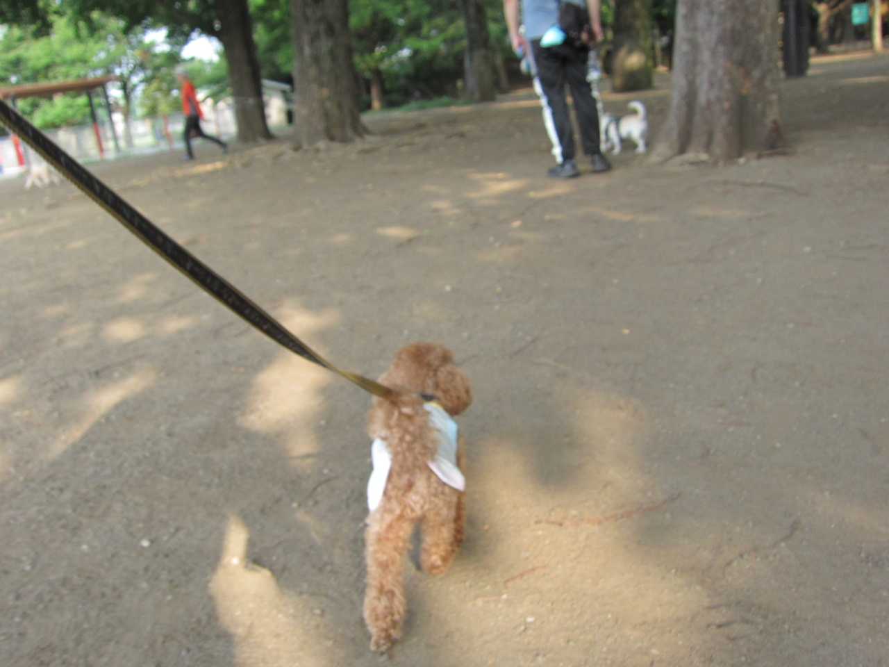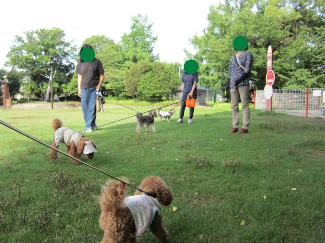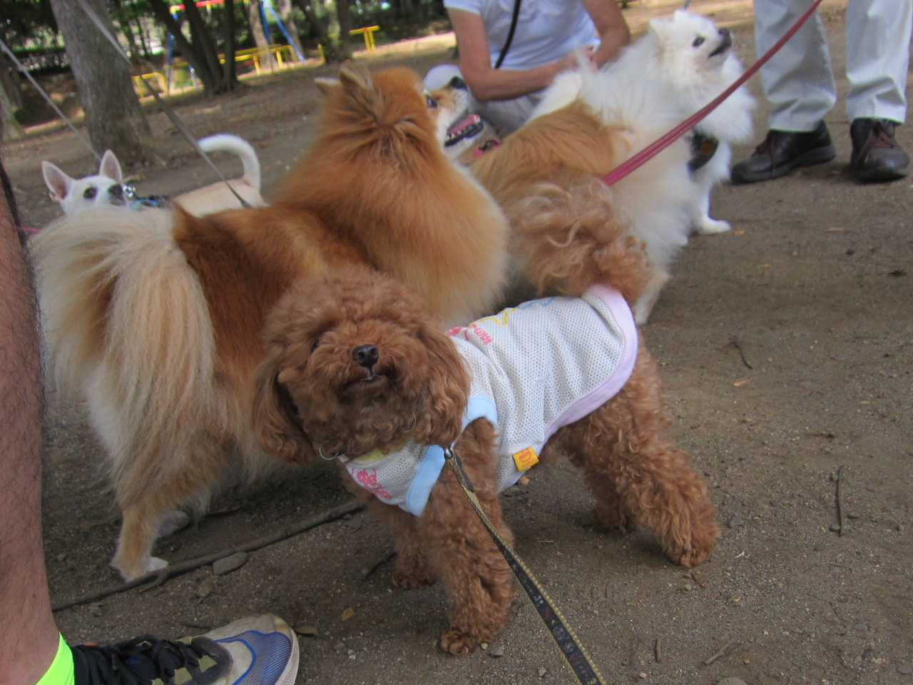 この週末もいつも通り、朝と夕方に公園に行ってきました。日曜朝、公園到着後、広場に行ってうきうきしているももに、お子ちゃまっぽいわんこが近づいてきたところです。お子ちゃまっぽいけど、体はももの何倍も大きいです。ももはすかさず身構えて、遊ぼうポーズっぽい体勢で身構えます。この後、すぐに走って逃げてました。笑もも:ややっ!怪しいわんこですわん!対決ですわん! ・・・・やっぱり逃げますわん。これは土曜の写真です。こんな感じで、お友達たちとわらわらと過ごしていました。もも:みんな、のん気に過ごしているわんねー。平和でいいことですわん。パパ:ももだって、のん気に見えるぞ。以上、ももの週末日記でした。