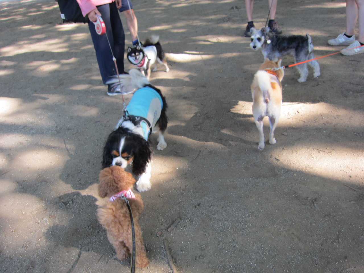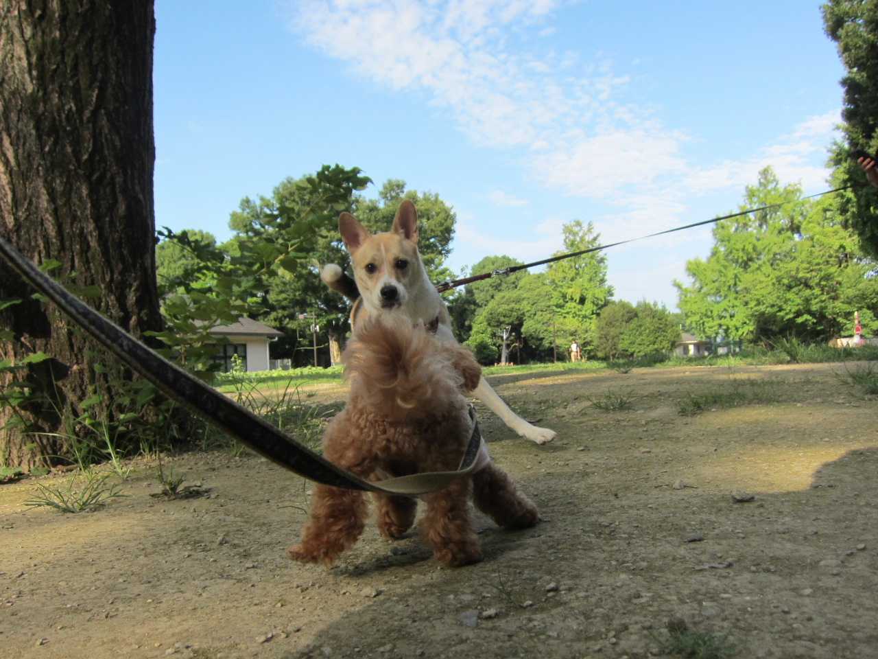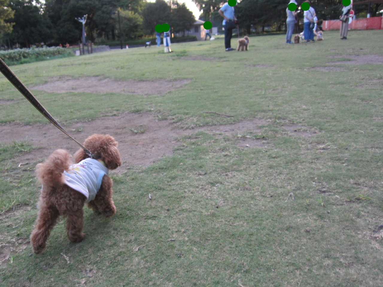 この週末もいつも通り、朝と夕方に公園に行ってきました。日曜朝、公園到着後、広場に行ってうきうきしているももに、お子ちゃまっぽいわんこが近づいてきたところです。お子ちゃまっぽいけど、体はももの何倍も大きいです。ももはすかさず身構えて、遊ぼうポーズっぽい体勢で身構えます。この後、すぐに走って逃げてました。笑もも:ややっ!怪しいわんこですわん!対決ですわん! ・・・・やっぱり逃げますわん。これは土曜の写真です。こんな感じで、お友達たちとわらわらと過ごしていました。もも:みんな、のん気に過ごしているわんねー。平和でいいことですわん。パパ:ももだって、のん気に見えるぞ。以上、ももの週末日記でした。