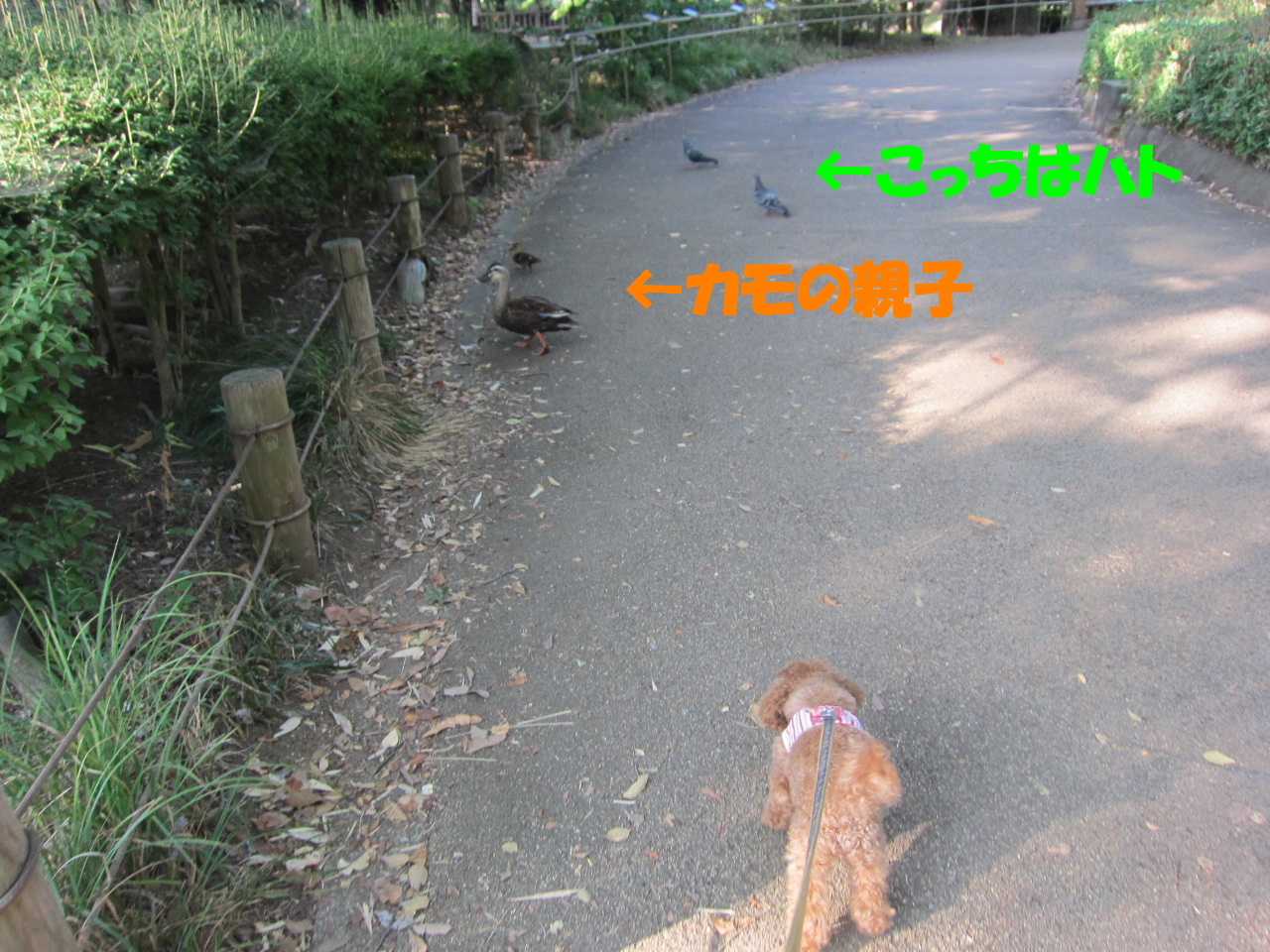 木、金の台風が通り過ぎて、雨上がりの気持ちのいい土曜の朝です。空気が爽やかなので、日陰が気持ちよかったのはいいのですけど、雨風のせいで地面に落ちたと思われる毛虫が、大きい木の下を歩いています。安心してももを歩かせることができないくらいの量でした。小型犬たちは、そのあたりには行かないで過ごしました。大型犬たちは気にしないで遊んでいるので、ももがそっちに行きたそうにしているところをパチリ。もも:パパ、行かせてくださいわん。男には行かねばならない時がありますわん!パパ:ももは男じゃないぞ(--;)。それに、行かねばならない時は、今じゃないと思うぞ(--;)。先週末に見かけたカモに会えました。子ガモたちが少し大きくなっていました。このまま元気に育ちますように。以上、ももの週末日記でした。