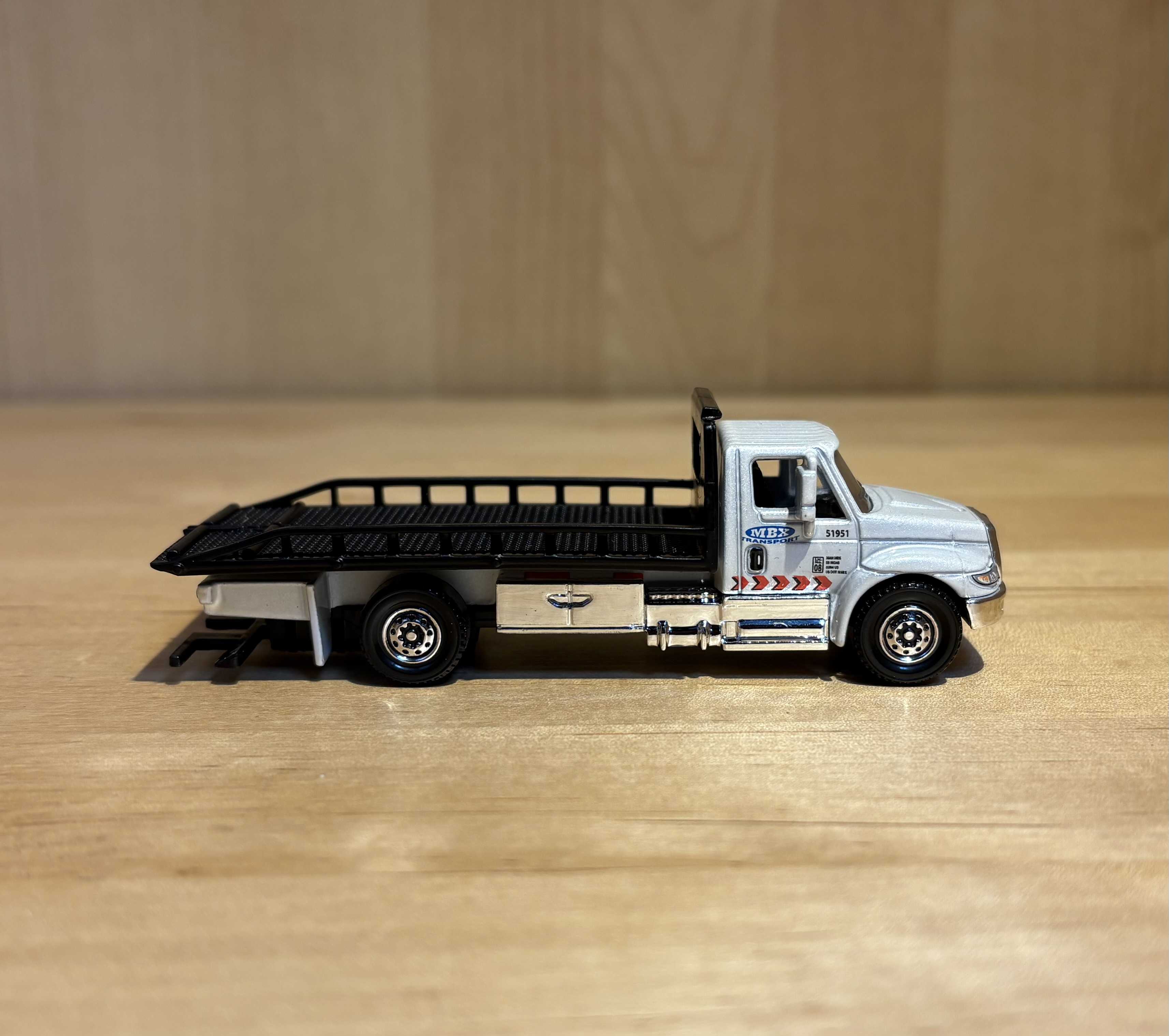 サイドを見るとかなりプロポーションが綺麗にまとまっていることが分かります。マッチボックスなので、"MBX TRANSPORT" と言う架空の会社のトラックになっています。ドアの右下部分にはしっかりとアメリカの法律で表示が義務付けられている業務情報が再現されています。細かいですね。