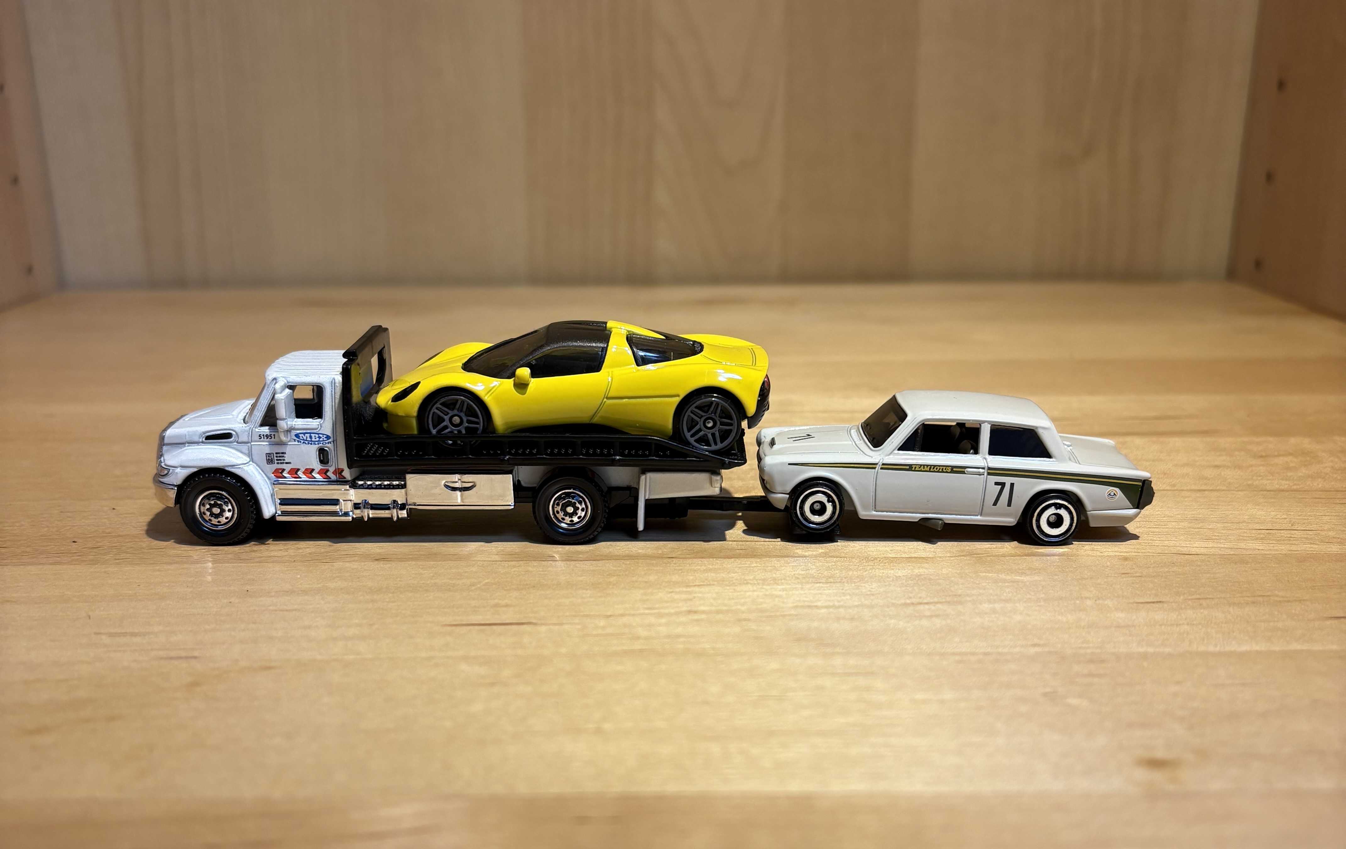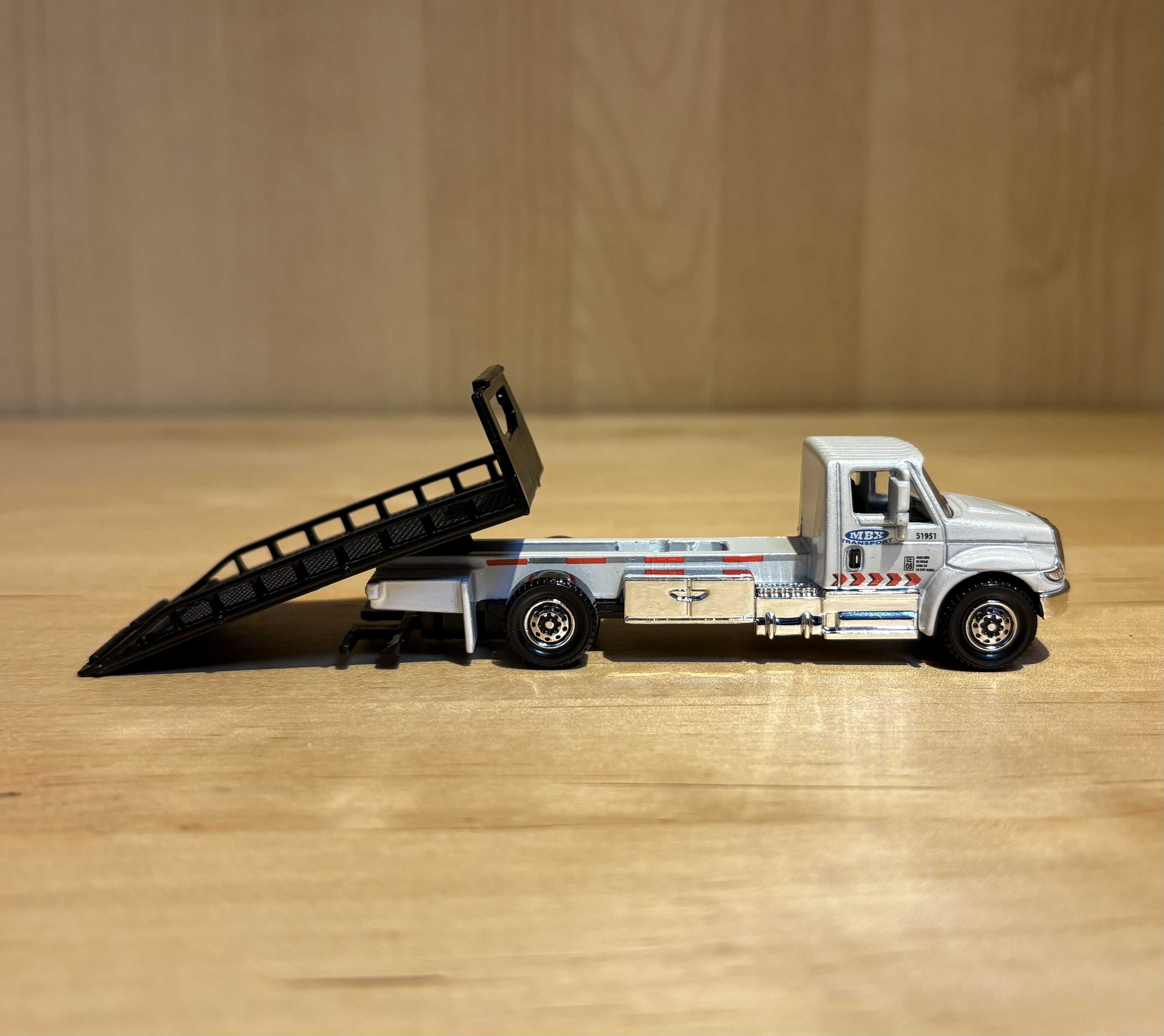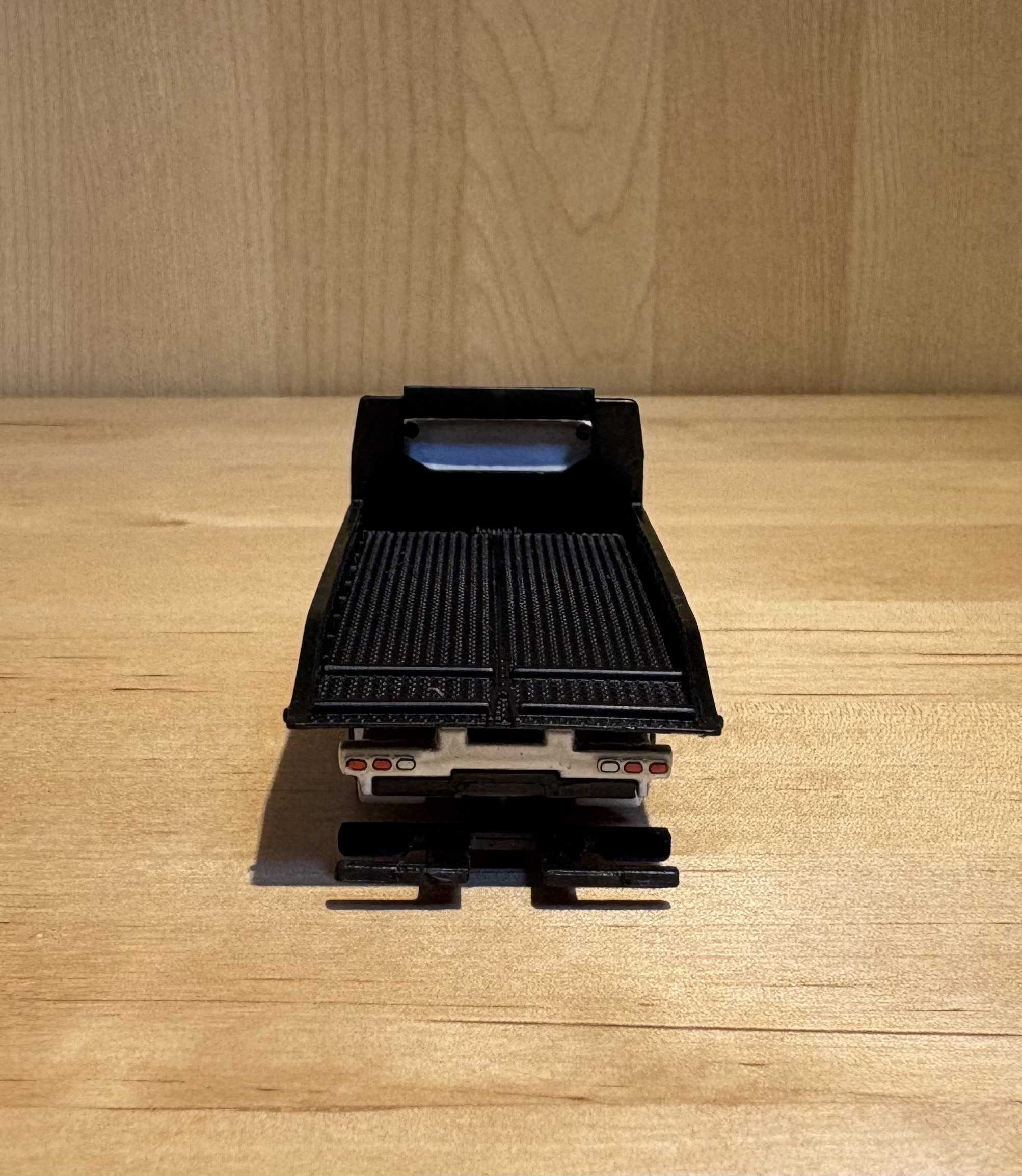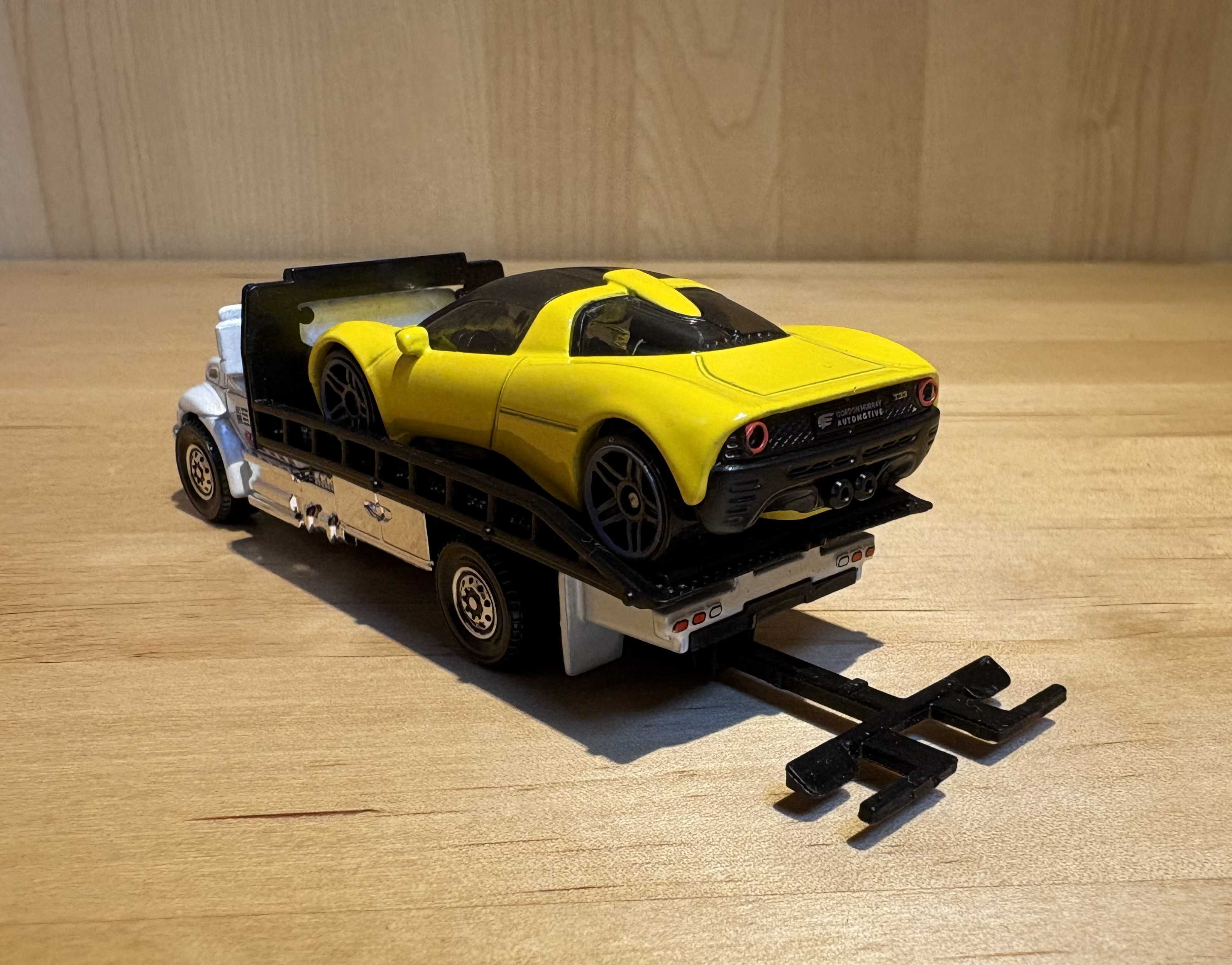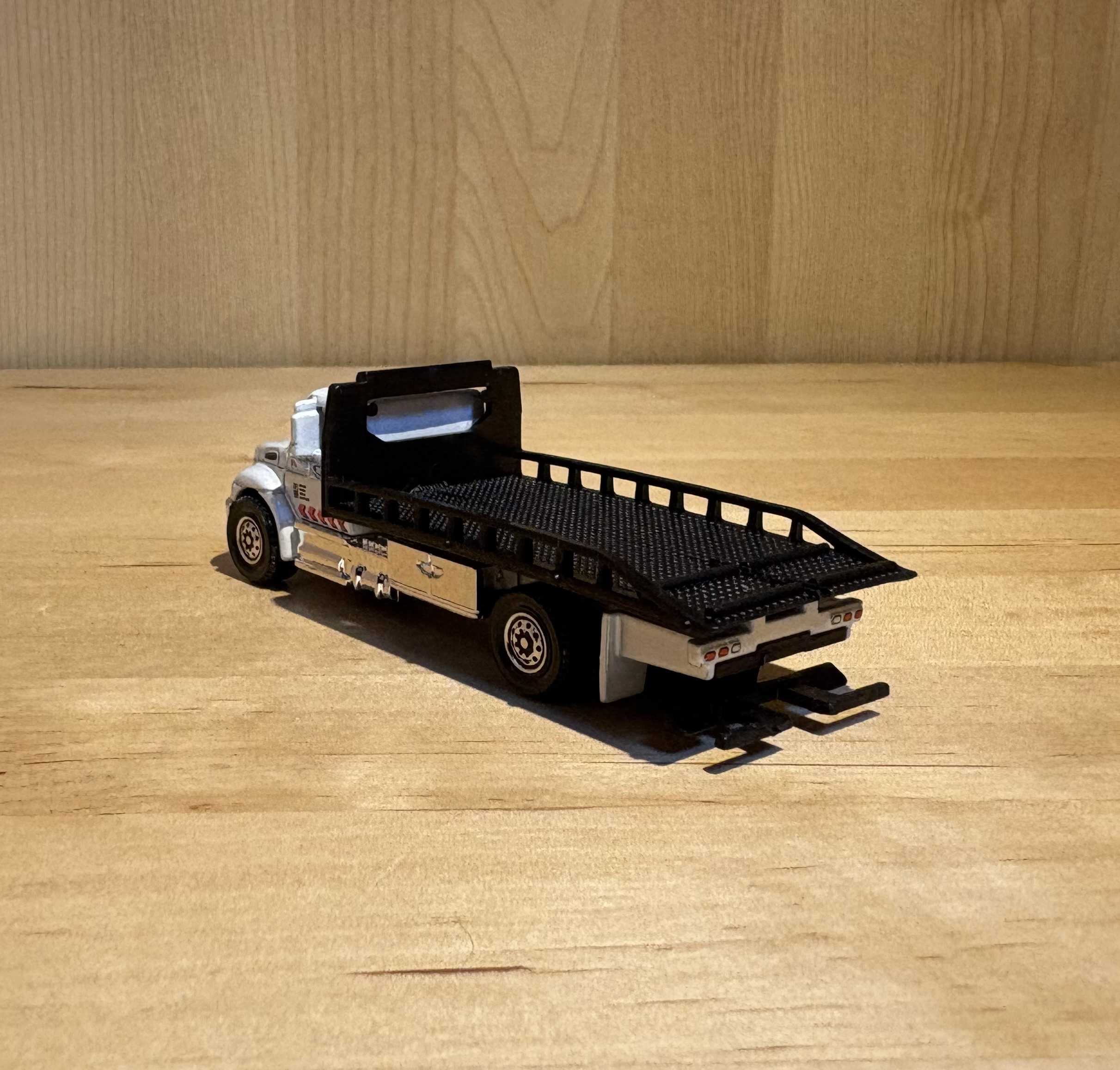 このトラックはフラットベッドトラックで、車を後ろに積む仕様です。後ろのテールライトも実物でよく見る形です。下のアームについては後述します。