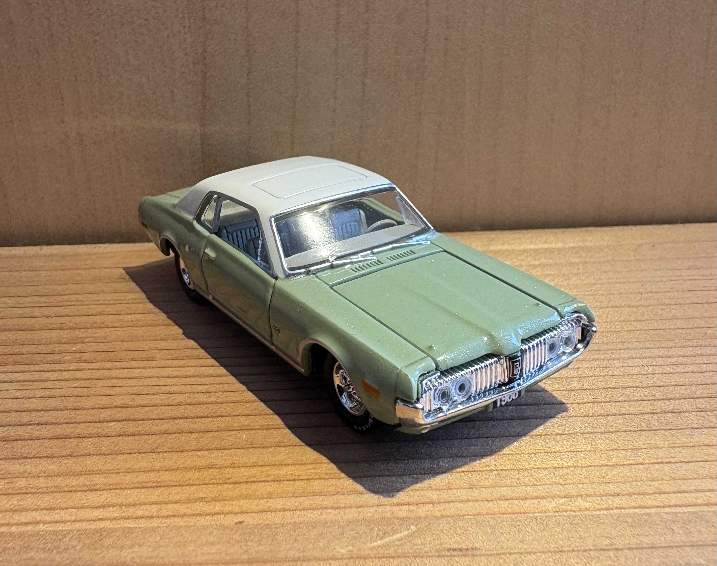今回はアメリカの名車、マーキュリークーガー390です。アメリカのミニカーブランド、M2 Machines の製品です。マーキュリーというブランドに馴染みのない方もいらっしゃるかと思うのでこちらの説明から簡単にすると、マーキュリーはフォードの中級車〜準高級車ブランドで、フォードよりはプレミアム、リンカーンよりは割安なブランドという位置付けでした。2025年現在、ブランドは消滅しています。そんなマーキュリーですが、おそらく最も有名なモデルがこのクーガーです。クーガーは一言で言うと高級なマスタング。中身は基本的にマスタングと同じでしたが、より高い値段で販売されたプレミアム版でした。デザインも丸みを帯びたマスタングとは一線を画し、トラディッショナルな角張ったアメリカンマッスルという感じのデザインを持っていました。マスタングとの大きな違いとしてV8エンジンのみがラインアップされていたことが挙げられます。マスタングは6気筒エンジンが提供されていたのに対しクーガーは全てのエンジンがV8だったのです。今回取り上げているクーガー390はその名の通り、390c.i. (6.4L) V8を搭載したモデルです。6.4Lエンジンですが、バッジには"6.5 Litre" の文字が。しかもイギリス式のスペルで。390c.i.V8を搭載したクーガーにはどうやらS Code と呼ばれる4バレルキャブレターを装着した320馬力のモデルと、X Codeと呼ばれる2バレルキャブレター搭載の280馬力のモデルが存在したようで、このモデルがそのどちらかは残念ながら分かりません。M2 Machines はトミカサイズのこのモデルでクーガーの魅力を見事に再現しています。ボディカラーはメタリックグリーンにホワイトのルーフ。レトロでかなりスタイリッシュな見た目です。そして個人的に気に入っているのがフロントのライト部分。ほとんどのクーガーのミニカーはヘッドライトが閉じた状態を再現していますが、これは開いた状態を再現している貴重なモデルです。M2 Machines の多くのモデルと同様、ドアとボンネットが開閉します。内装もしっかり作り込まれています。製品の品質にばらつきが見られるM2 Machines ですが、今回のクーガーに関しては極めて出来が良いモデルといえます。個人的にとても満足な一台です。