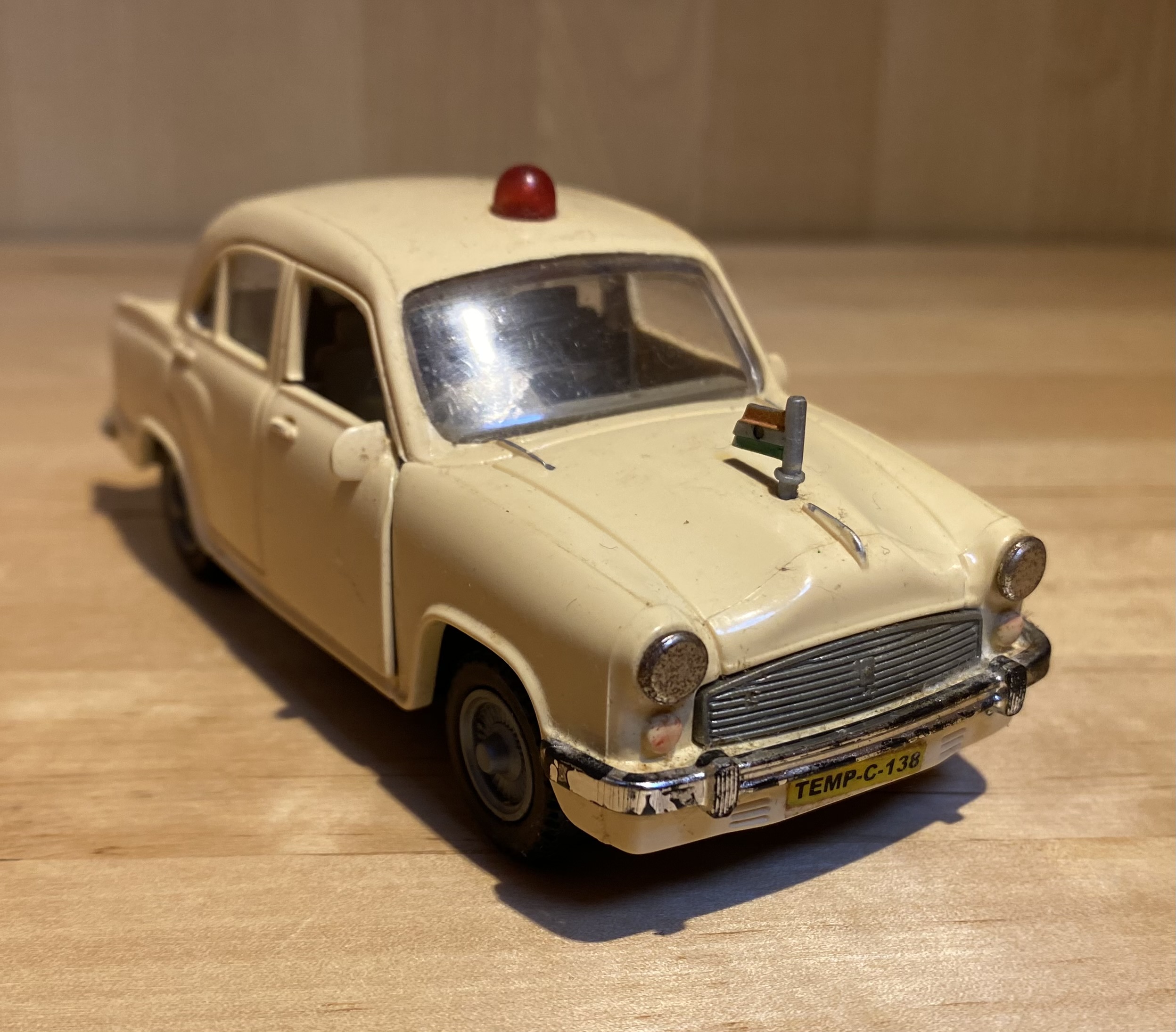 こんにちは!今回は少し変わり種のモデルを紹介します。インドではお馴染み、ヒンドゥスタン アンバサダーです!日本では滅多にお目にかからない車なので、簡単にアンバサダーの紹介をしたいと思います。アンバサダーは元々はモーリス オックスフォード シリーズ IIIと言うイギリス車をインドで生産したものです。インドがイギリスの植民地だったために生まれた車、と言えます。1958年から2014年と言う長期間にわたって生産されたご長寿モデルです。モデルチェンジなしで生産された車としてはおそらく世界トップクラスの生産期間でしょう。今回ご紹介しているモデルはVIP CAR と言うバージョンですが、これは政府の役人を乗せる車だそうです。ボンネットのインド国旗が可愛らしく再現されています。ちなみにこのモデルはCenty Toys と言うインドの会社が生産したもので、インド製です。プラスチック製のプルバックカーなので、質感は結構チープです。Centy Toysはアンバサダー以外にも様々なミニカーを作っているようですが、どうやらライセンスをとっていない商品のようです。例えばどう見てもスズキ スイフトのミニカーが"ドリフト"として売られています。興味のある方はウェブサイトを見てみてはいかがでしょうか。Centy Toys ウェブサイトインドが経済発展するにつれ、このようなライセンスをとっていないおもちゃは徐々に姿を消していくと思うのでこれらを見られるのは今だけかもしれませんね。
