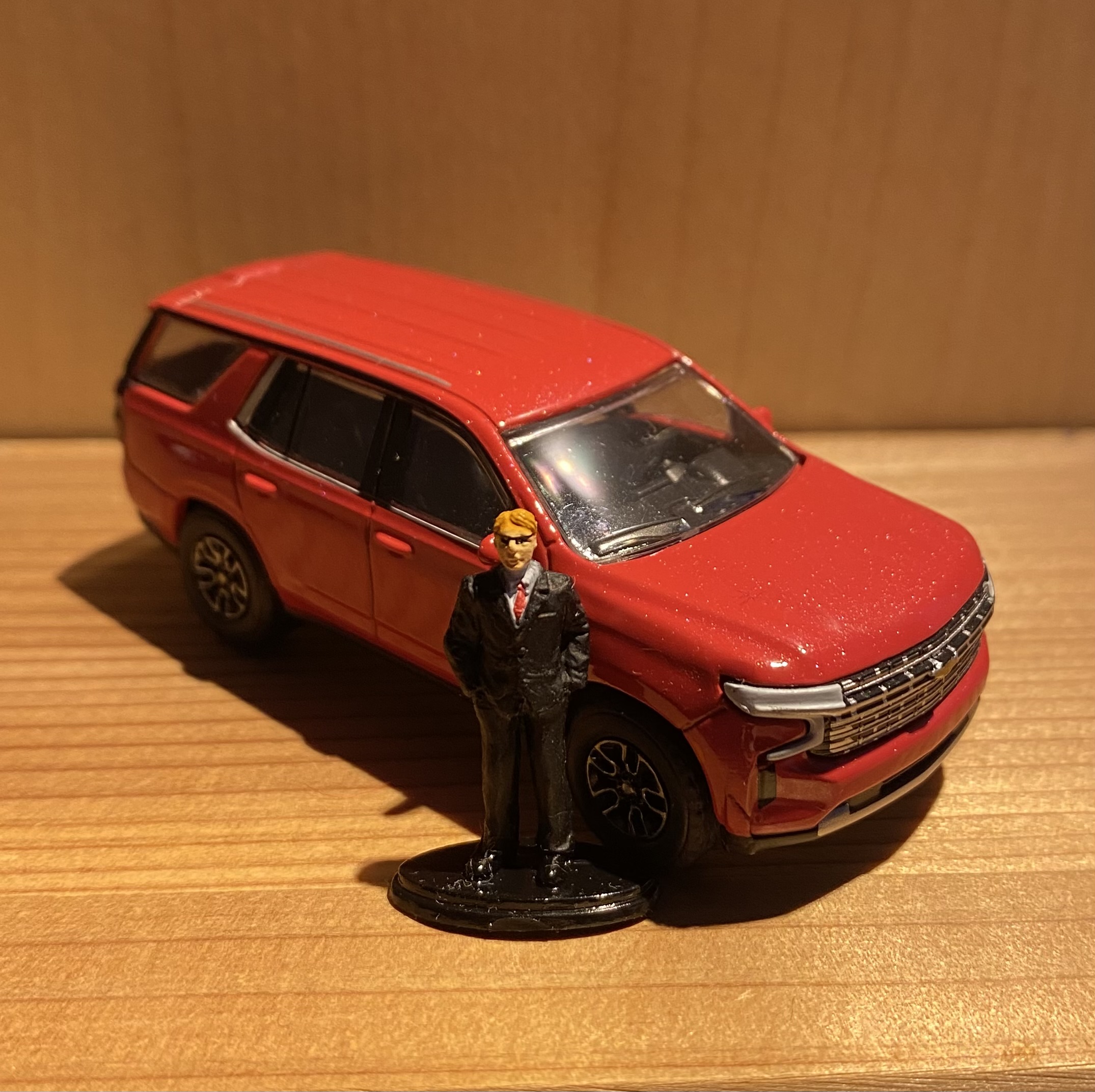 こんにちは!今回は1/64 Green Light製のシボレー タホ LT テキサスエディションの紹介です。シボレー タホはシボレーのフルサイズSUVです。サバーバンというSUVもありますが、これはタホの後ろを伸ばしたものです。中身はピックアップトラックのシルバラードと同じなので、アメリカではタホやサバーバンのことを「トラック」と呼ぶ人もいます。テキサスエディションはタホやシルバラードに設定されているパッケージで、快適装備を追加したものになります。なぜテキサスなのかというと、タホがテキサスで生産されており、テキサスでとてもポピュラーな車種であるからだそうです。クアッドエキゾーストも再現されています。このモデルは"Hobby Shop" シリーズからリリースされたのでフィギュアがついています。CSI:マイアミのホレイショ ケインみたいな男の人ですね。