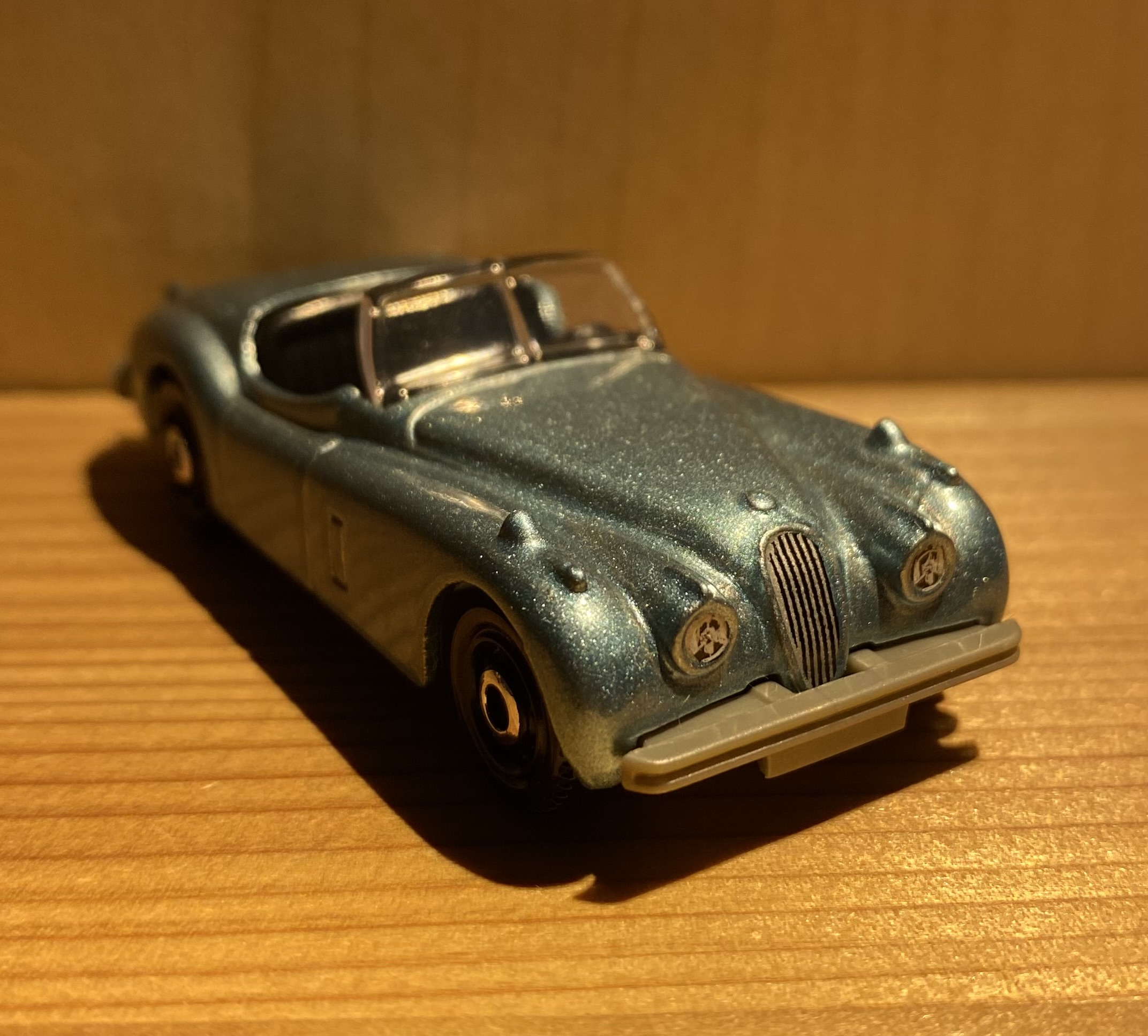 こんにちは!今回はマッチボックスのジャガーXK140のご紹介です。ジャガーXK140は1940年代後半から1950年代前半にかけて製造されたスポーツカーです。流麗なデザインは今でも多くの人を魅了しています。マッチボックス(Matchbox) ベーシックカー Cアソート【ミニカー24台入り BOX販売】 【3才~】 98BC-30782マッチボックスはベーシックカーとしてこの車をモデル化しました。アメリカでは1ドルで販売されているモデルなので、予算的な制約はあったと想像しますが、かなりしっかりと作り込まれたモデルで、実車の美しさをうまく反映しています。メタリックブルーのボディカラーも映えています。後ろに伸びるようなシルエットが今の車にはないエレガントさを醸し出しています。フロント周りも可能な限り印刷が取り入れられているので実車に近い雰囲気を持っています。リアもテールライト、トランクハンドル、ナンバープレートと、印刷が多用されており、ベーシックカーとしてはかなり細かなところまでこだわったモデルといえます。これが1ドルとは驚きです。