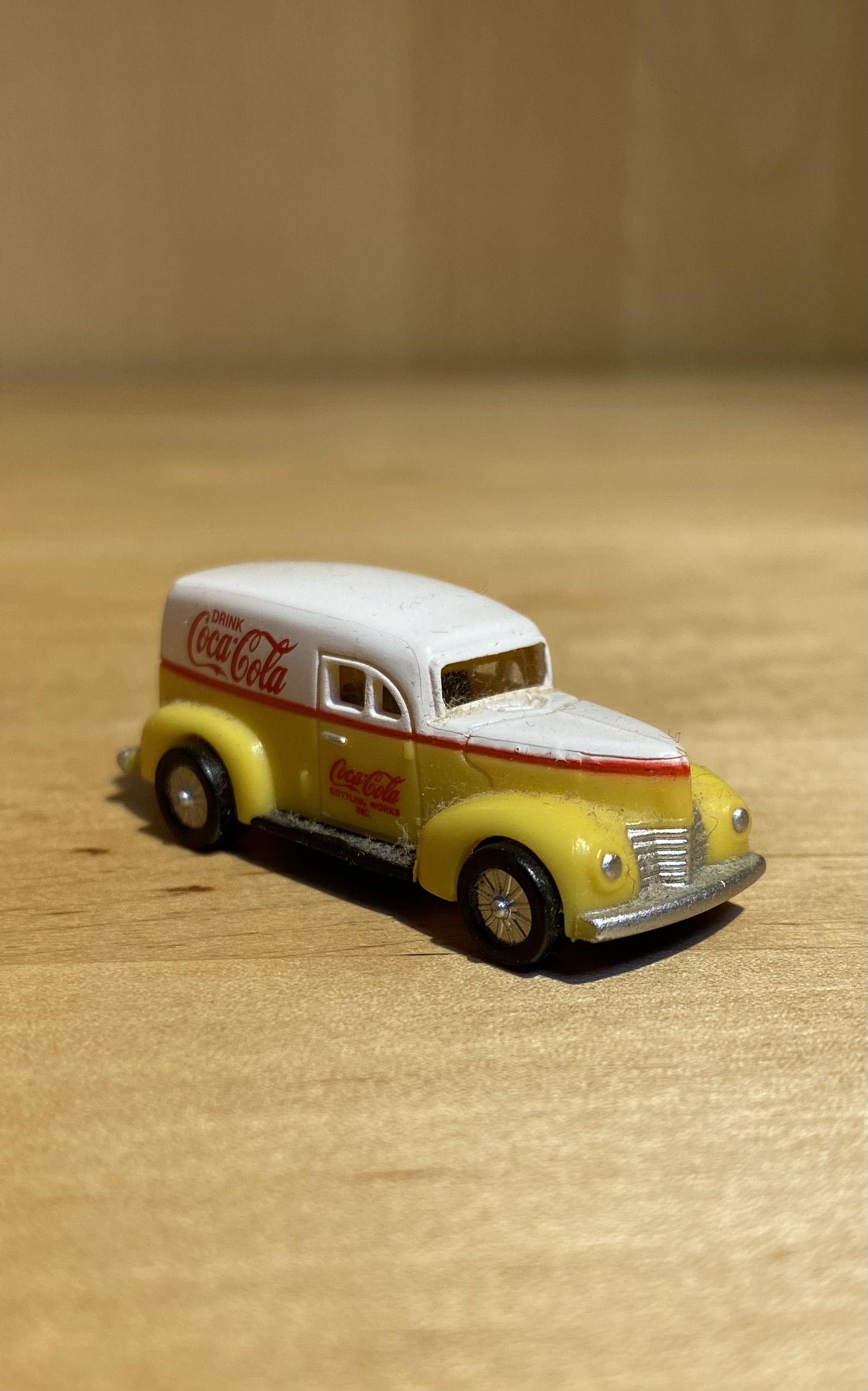 こんにちは!今回はかなり昔のコカコーラのおまけの紹介です。昔はミニカーがおまけとして飲み物についてくると言うこともしばしばでしたが、最近はほぼ見なくなりましたね......今回取り上げるのはこのフォードパネルバンです!プラスチック製のモデルで、1/87スケールくらいのサイズです。シャシーには一応フォードとしっかり刻印されているので、ライセンスは取っているように見えます。古き良きアメリカ、と言う感じのモデルでいいですね。リア。古い車なのでテールライトは片側のみ。コカコーラといえば赤いイメージですが、黄色も比較的よく使われていますね。どちらも「美味しそう」と言う気持ちを刺激する色なのでしょうか?ぜひミニカーのおまけは復活してほしいですね。