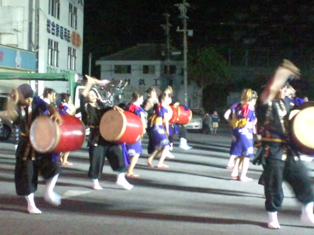 帰りにふと見ると、すぐ近くのコンビニ駐車場で、なんとエイサーを踊っている一団を発見!そっか…「お盆」なんですね…。当然、見学。