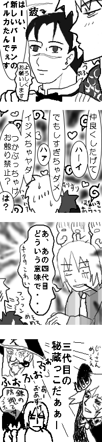 ※パラレル四コマですホスト四コマもひさびさなら、このテーマに投稿するのも久々のなおりんぐです。きっと、もうみんなワケわかんないでしょうが、フォロゥミィ!人間知ったかぶりって大事だ!さぁ、みんな、ご一緒に!シッタカターシッタカター、シッタカタッタッターー(壊)CLUB木の葉 ホカマン(火影漫画)『寸止』おあずけで暴発寸前のヨンタマその矛先はどこに向かうのかこうご期待!(しませんって)なんかね、秘宝館も追加したいし、ノベルも書きたいし、アフォイラを整理したいしアンソロ読みたいし、マンガ描きたいし、やりたいことだらけの青春真っ只中のオレサマ!でもねー、どうにもねー。かぜひいたっぽぃ(´-`)アハッ☆気づけばもうすぐリー誕じゃねーか!参加忍のテロップとか流してないよ。っていうかあまりに早く告知して、参加忍がよくわからなく(殴☆もうね、ブログの更新とレスでせいいっぱい臭い。今日はコレで失礼して、明日リボーンみながらがんばろう。(みるんだ)もう熱っぽいのか、首のあたりがまるでなんか憑いたように重い。喉痛い。でもきっとバカなので死なないっぽぃ。ということでお見舞いコメントはいりませんぞ☆アフォに同情してはいけません。もう何かいてるのかわからない。まるで今日のヨンコマみたい。あぁぁぁぁ、カウンタと共に時間が巻き戻っているのかしら。イノセンスはつどーーーーっ!ブッ(ぉぃなんか捨てたっぽぃ