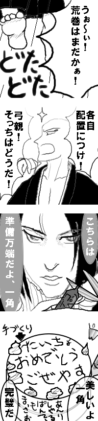 アフォ漫画&イラストあり今日は剣ちゃんのお誕生日だよっっvv(やっちー風)ノーマル路線なので隠しません。スクロールしてみてやってくだせぇ。たいちょに虜のイレヴンズ剣ちゃん、おめでとう~~っ!そのころ十一番隊舎の外ではたいちょのために、エンヤコラセッ