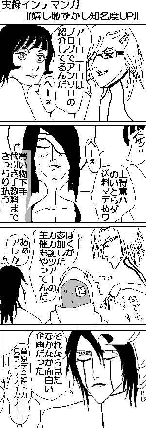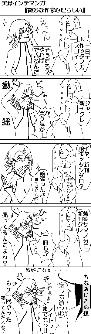 えとですね。本日2回目のウェブカレの〆切ですよ。ちゃんと全て出揃ってますよ。おっさんの作業がトロトロしてるだけで。なんでかっちゅーと、インテマンガを描いてたからさ!ウェブカレの配信は22日を目標に・・モゴモゴがんばります!(絶叫)では、インテマンガ。昨日説明不足でしたので、その他十刃サンの軽い説明を。 ルピ=I子嬢。なんかザエルのカノジョらしい。(ぇえええ! 買い専門なのにザエルのスペを手伝わされている。ギアススキー。 ウルキオラ・シファー=Cクリ嬢。四カカ作家さん。 ハリベル=U田嬢。買い専門で、映画系。ERのタラシ小児科医がすきとか? スターク=Mいむ嬢。カカイル作家さん。カカテンもアリ。とまぁ、バラエティに富んだ内訳だったワケです。愉しい時間が過ぎるのは早い。皆さんとインテで別れて虚圏に向かうノイトラとアーロニーロでした。昼飯を生中とラーメンで済ませたのでものごっつ腹が減りザエルがくれたおやつを思い出す。中身はルミーナとベローナではなく、鳴門金時スイートポテトと鳴門オレンジピール。こだわりの一品。本町駅で喰らうが、さすがに暗殺用。かなりムセたのであった・・・。(遠い目)・・・<了>