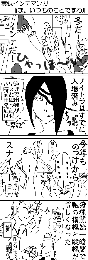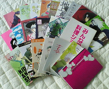 そろそろMュン変のネタに入らないと今週中に終わらない!つーことで、本日二本目は実録インテマンガです。毎晩、ノーマル本を読んでみたりもしてますがカカイル本も欠かさず読んでます。だって、わたしの酸素ボンベだもの!しかし、アレですな。えろは小説のほうがスキです。潔いほどにえろですから。サラリと。こんな会話もインテならでは。さまよう我らには「も」とか「や」とか何よりも重要!ざえるは恋人サン(?)に「この荷物だれの?」と問い詰められたっぽぃ。カノジョも明日インテマンガに登場します。仮にルピたんをあててみることに決定。