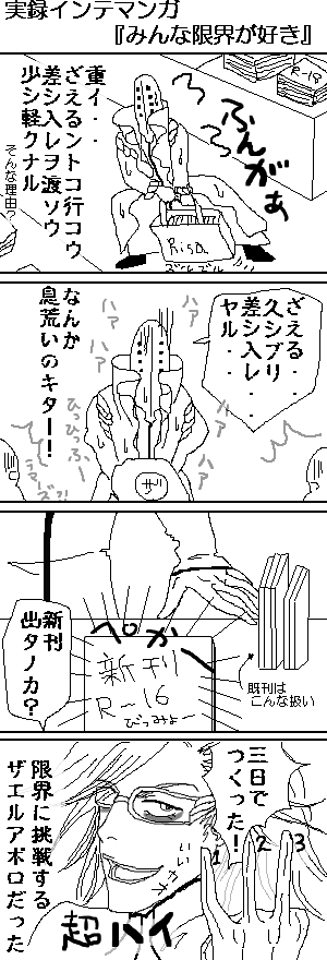 今日のリボンは腐女子向けでしたね。あれっ!違うの?!相変わらずツナさん総受でvvくそっ京子ちゃんかわいいじゃねーか。まぁ、ハルはいいとして。ビアンキ怖すぎ!大蛇丸?!?!たまりにたまっていた「るろ剣」を観た。そんで さのX津南 萌え しております。おまえら、どんだけ愛し合ってんだ!きぃっ!おっさんにとって剣心はまだ萌えの対象になっておりません。対してサノさんは攻めであってほしいが総受くさい。そういう目でしか見れない 前はだけのサラシ男vvあかん。剣心みながらインテマンガ描いてたんで、アホほど時間かかった。ありえん。ということでインテマンガです。本数の多さに焦りが見え隠れ。便宜上 I子嬢=ルピ Cクリ嬢=ウルキオラ・シファー U田嬢=ハリベル Mイム嬢=スターク で いきます。ちなみに「Mュン変」とはインテの二階にあるせいで年に何回か腐女子の総攻撃を受けるあわれな軽食喫茶。居酒屋でもないのに昼間から生中がなくなることがある。爺萌え発言でザエルに「サイテー」を連発される今頃気づいたのか。クス