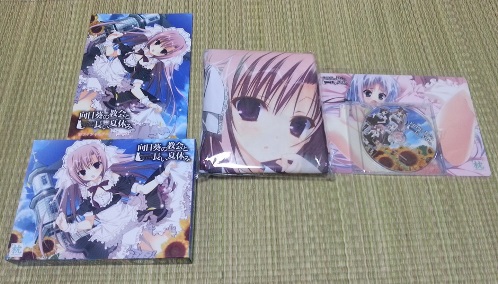 ついに引き継ぎ関係も終わって休みに入った今日枕からの新作ゲーム「向日葵の教会と長い夏休み」(通称ひまなつ)買って来ましたよっとbなんか自分への卒業祝いみたいになってしまった卒業祝いがergかよっていうのはあれだけど ちなみに購入場所はソフマップです店舗予約特典は一つ目がこのベッドシーツまだ広げてないのであとでアップします で,2つ目と3つ目が下敷きとドラマCD下敷きはアウアウだったのでCDで隠してますw 計3つの店舗予約特典ですね いやぁー豪華 そして,こちらは予約特典のオフィシャルアートワークス40Pぐらいありますね いつもこの中のラフ絵を見るのが楽しみで そして本体 まだ開けてないです 中に初回特典の複製色紙が入ってるそう雛桜だといいな 基4さん好きなのでこちらも後でアップするとしましょう というわけで,今日から新生活までは「ひまなつ」で一足先に夏気分を味わって楽しみましょう