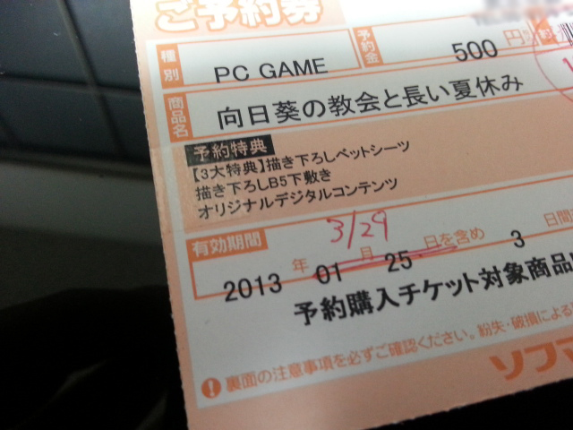今日は早く帰れたのでソフマップによって『向日葵の教会と長い夏休み』通称”ひまなつ”の予約をしてきました が・・・なんと発売の日付が3月になってる ん,ん? なぜ?とりあえず予約して,twitter見てみると延期のお知らせがちょうど年度の変わり目だからあまり,嬉しくない発売日だけどまあ,楽しみに違いはないので いいのですが あとクオリティUPするみたいですし