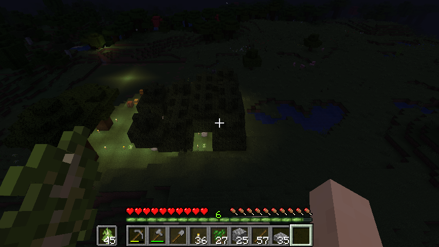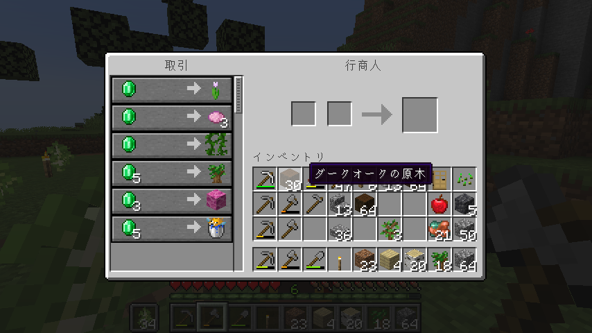 いずれ植林場を建てるとして、最初に天井がいらないタイプの木2種を入手できてしまったので、とりあえず仮拠点近くの開いている平地に適当な間隔で植えています。