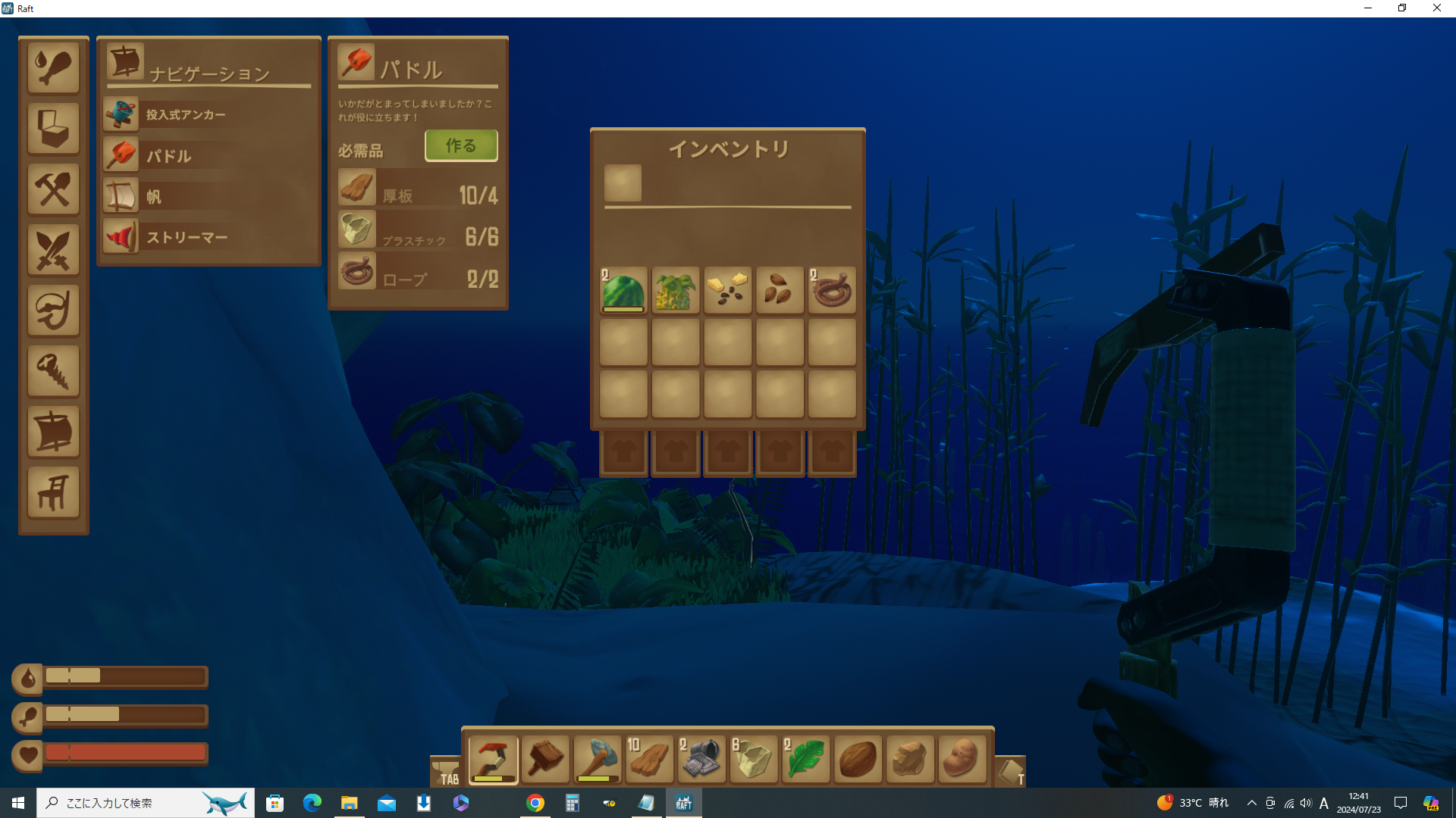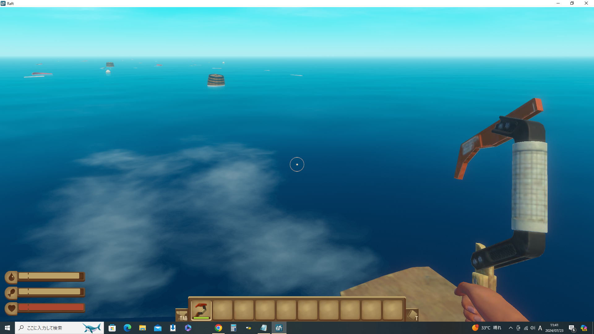 おはこんばんちは、最近ヤクルトの炭酸割りにはまっているもふ月です。1000をセブンの強炭酸で割るのが一番好みの濃さです。ヤクルトを飲み始めてから長年の悩みだった便秘もあっさり解消されて乳酸菌の凄さを実感しています。娘が絵本や図鑑にはまり、色々な生き物の話を毎日何時間も話している内にサメとダイオウイカを特に気に入ったようです。しかしサメの怖さは口で言ってもいまいち伝わらない……と思い出しました。Raftがあるじゃないか!という訳でSteamで購入し……あれ?既に購入済み……?そうです、販売開始して少しした頃にまとめ買いセールで購入したんでした!全然遊んでない(;´・ω・)もだもだしつつ、すんごい今更ながらのRaft、開始です。地平線が見える所からスタートするマイクラに慣れてるから海って新鮮、というよりすっごい不安になる(;´・ω・)どうしてこんな所にスポーンしちゃったんですか?ここに来るまでにどれだけ気失ってたの?大丈夫?特にストーリーがあるでもなくただただ広い海にポーーーンと出てきました;;え、これ何……?手に持っているフックみたいな物でものを捕まえて引き寄せる、というのはおすすめ動画で観たので知っているけれど、使い方までは知らないんですがーーー?と5分くらいもたもた操作方法確認に費やしてしまいました。長押しで遠くに投げられるそうで。ただクリックしてしまい足元に落としまくってしまった……Tabを押すとインベントリが開けました。色々作り方は知っている状態の様です。サバイバル大好きっこがうっかり漂流しちゃったのかな?初期のマイクラは並べ方覚えるの苦労したんよな~とちょっと懐かしくなりながら色々見てみます。サバイバルゲームにはよくあるラインナップ。とりあえず足元4マスの木の板しかなくてやばいので早急に材料を集める必要があります。何もかも足りないよ!幾つかアイテム入ってるタルが流れてきたらちょっと嬉しい^^ヤシの葉、木の板、プラスチックと樽や木箱が流れてきてます。お目当てのサメもずっとイカダの周りを泳いでいて娘大興奮。海に落ちたら襲われるってのに、このイカダは頼りなさ過ぎるよ!しかも時々サメにイカダをかじられてしまうんですが、このそこそこ殺傷力ありそげなフックでは殴るどころかつつく事すらできないらしくて無反応。ただただ目の前で齧られていくのを見つめる事しかできませんでした。沈んじゃう!!!もっと必死になれよ!!!!木の板とかヤシの葉でも目つぶしくらいできるだろ!取り乱しながらとりあえずできる事を探します。ヤシの葉は目つぶしはできませんがロープの材料になる様です。きっと色々な部分に使うのでいっぱい必要になりますね。樽を開けたら「生のジャガイモ」と「スクラップ」が出てきました。生も食べられるみたいですが、簡易グリルのレシピがあるのできっと焼いた方が良いんでしょうね。釣り竿もプランター(何故か土入り)もあるので食事は魚メインなのかな?でも釣り竿、結構材料必要なようで……しかものど渇くのが結構早いので魚の前に水が必要そう。「簡素な洗浄機」というのが水に必要です。あとプラスチックのカップ。イカダの上で火を焚いたら燃えちゃわない?どうやって火起こししてるん?木湿ってて燃えなさそうだけど?とか無駄な創造している間に前方にうっすら何かが見えてきました島だー!というところで今回はここまで。材料集めて建築用ハンマーを作り、サメにかじられたイカダを作り直したところまででした!全然進んでない^^操作ど下手過ぎるのと娘がサメを見たがって操作進まないのとパソコンが古すぎるのとで、今後ものんびりゆっくり進めていきます。次回は島に向かいます!というかイカダの向きを変える方法が今の所無いので激突します!!ではまたごきげんよう、楽しい一日を~―――――――――――――――――――――