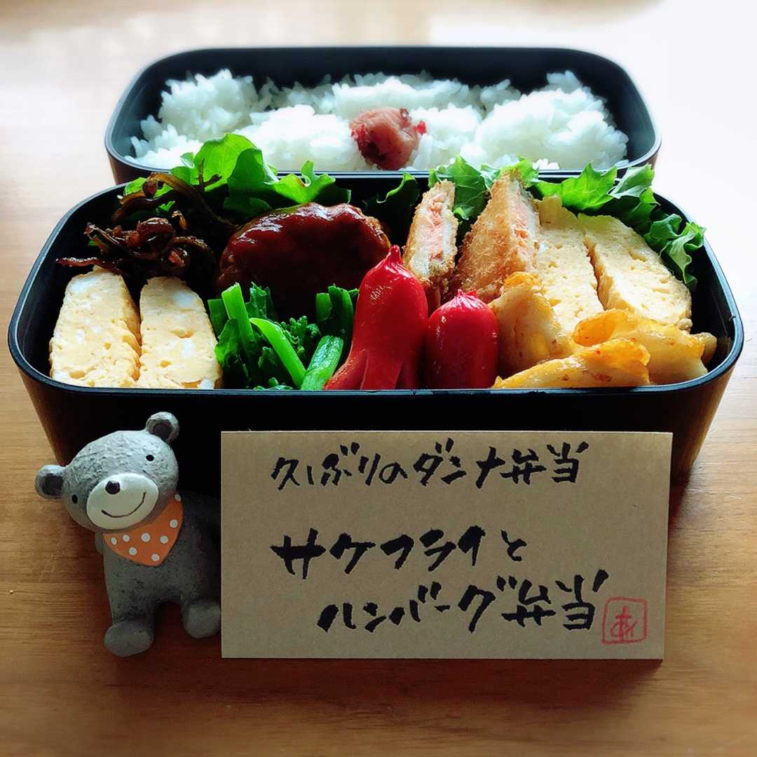 こんにちはありすです今日は久しぶりのお弁当ブログ鮭フライとハンバーグの豪華お弁当ですハンバーグ・鮭フライ・玉子焼きウインナー・レンコンの天ぷらほうれん草のおひたし・いかなごのくぎ煮