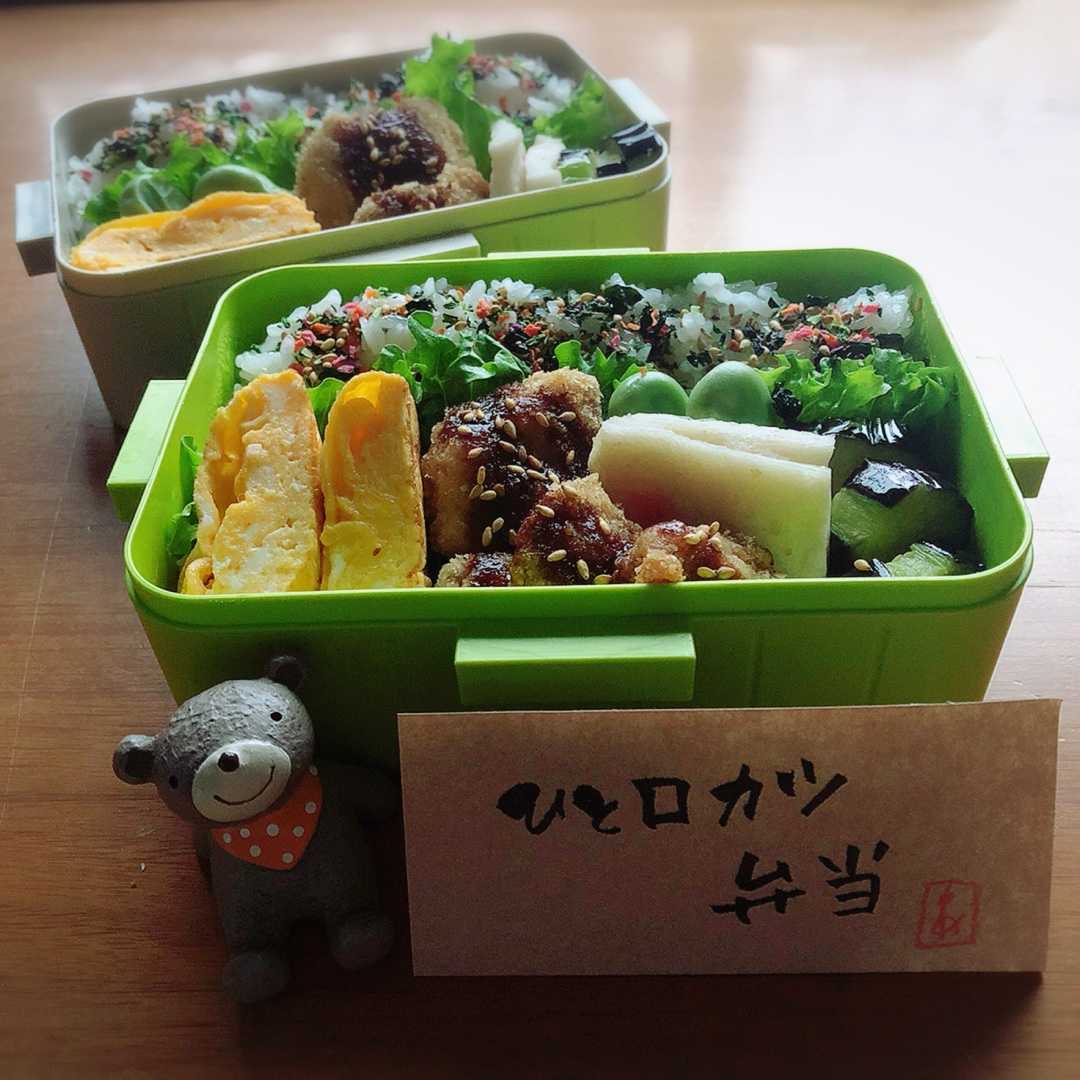 こんにちはありすです今日のお弁当はこちらひと口かつ弁当ひと口かつ・玉子焼き茄子の揚げびたし・空まめ紅ショウガ入りさつまあげ