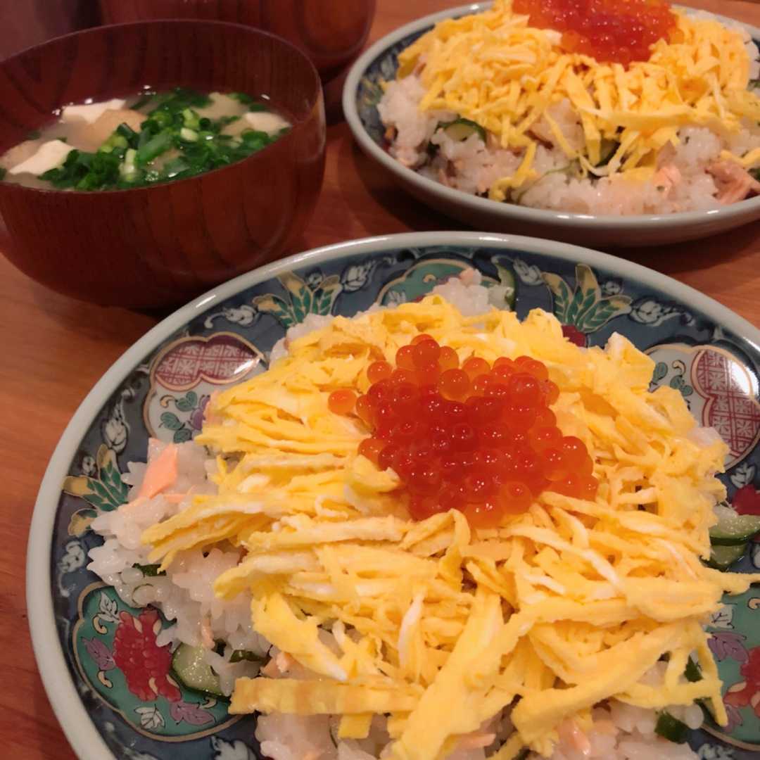 こんばんはありすです毎年きちんとご飯を作るのですが引っ越し疲れがダウン気味なので今年は簡単なちらし寿司にしました錦糸卵を作ってきゅうりの酢の物大葉は千切りにして焼き鮭をほぐして完了あとは混ぜるだけで完成ですイクラをトッピングすると豪華で華やかになりますよ