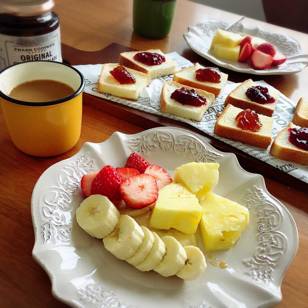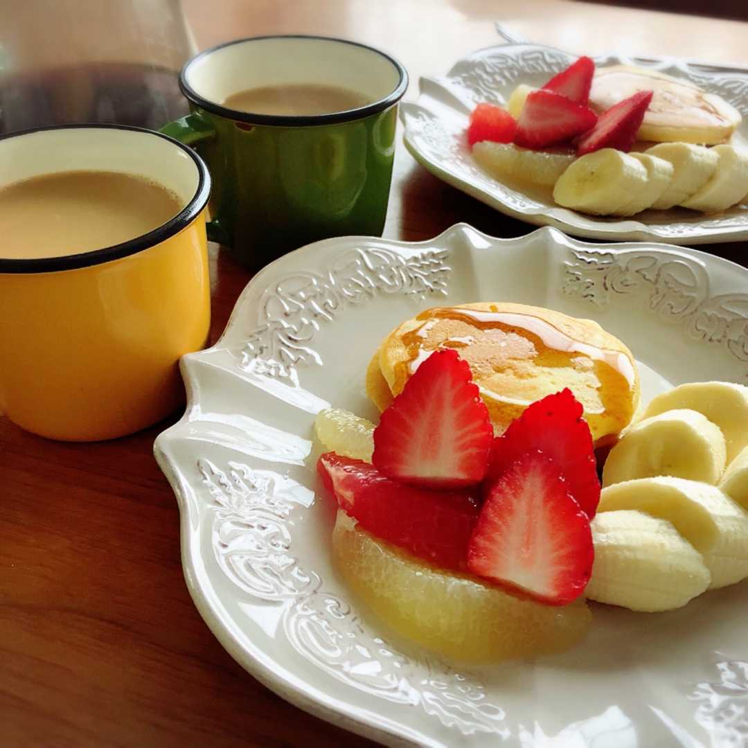 おはようございますありすです今日の朝食はパンケーキと果物だけたっぷりの果物とメープルシロップ!最高!!!