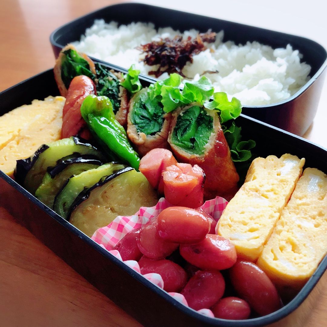 野菜の肉巻き、玉子焼き、茄子の揚げ浸し