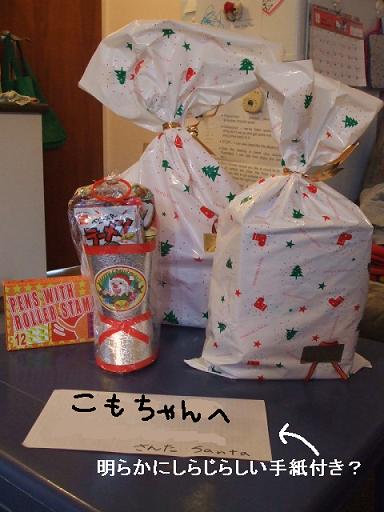 今日は待ちに待ったクリスマスです!初めクリスマス、と聞いて何かやろうかと思ったのですが、我が家はご存知の通りオーブンもありませんし、コレと言った特別な料理も用意できるわけではありませんまぁ、いつも通りの食事にちょっとケーキでも食べれば、なんて思っていたら、reikoちゃんのホストマザーであるLilからお誘いを受けた、というわけです。こちらに住んでいる人のクリスマスを体験できるなんてなかなかないですから、これは楽しみです!---さて、当日の朝。クリスマスの朝…、と言えば、そうです。良い子の元にはプレゼントが届く朝ですっ!!以前からkomoはあるモノを欲しがっていました。しかもそれはもう半年以上おねだりしていたものなんですkomoのサイズのものはこちらでは見つからないし、と半分諦めていました。そんな時、サンタさんはどうやら日本に支社?を持っているらしく、クリスマスを間近に控えたある日、日本から小包が届きましたよ(笑)!komoが起きる前から机の上に準備をしておきました。起きて来たkomoは寝ぼけまなこで「??」という様子。開けてごらん、komoちゃん!「あ~!すーちゅけーしゅだ!」komoはお店でスーツケースを見つけて以来、「なんでおとうさんとおかあさんはもってるのに、こもはないの?」と欲しがっていました。珍しく泣いて欲しがる時もあったくらいです。でもこちらではサイズが小学生くらいの「子ども用」しかないため諦めていたところ、なんと、たまたまokaばあちゃんサンタが送ってくれていた、ということなんです。なんたる偶然っ!しかもサイズは通常の子ども用の約半分なので、komoにピッタリのサイズです。中には…?中身を全部空けたら、こんなにいっぱいのものが入っていました!shikaばあちゃんが送ってくれたコロコロローラーペン、早速遊んじゃいました!---朝からテンションが上がりっぱなしのkomoさん。スーツケースをパーティで皆に見せると言って聞きません(笑)。さぁ、おにぎりを作ってパーティに行くとしましょうか!長い長いクリスマスの一日の始まりです!