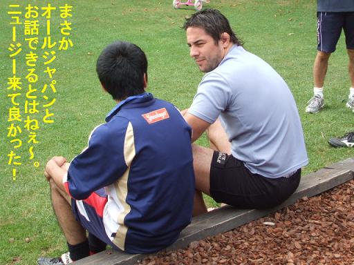 ニュージーランドに来てからというもの、色々な出会いをしているmoja家ですが、今回もまたまた不思議なご縁がありました…。---今日もプレイセンターのmoja家。ottoは運転免許の試験のため遅れて来る予定です。久しぶりにkomoと2人でのセッションです。今日のセッション、1組新しい家族が見学にやってきました。センターはいつでも見学者大歓迎なので、SuzieやJudyが出迎えてセンターの内容を説明していました。子どもさんは2歳くらいの男の子です。私はkomoと一緒に外で遊んでいると、そのお父さんがチラチラと私達の方を見ています。えぇ~?セクシーすぎてゴメンなさいって感じ??←完全勘違い--目が合ったので、ニッコリ微笑んで自己紹介しました。そして、私が「私達、日本人なんです。」というと、そのお父さんが、「ワタシタチ、ニホンニ5ネンスンデマス~」って、え??--彼の名前はフィリップ、5年間日本に住んでいて、この2ヶ月だけ帰国しているkiwiなんだそうです。っていうか、何で日本に住んでいるの??お、お仕事はナニをなさっていらっしゃいますのん?…、え?今なんて??え??オールジャパン????なんと、彼、ラグビーの日本代表なんですって!!!--彼の名前はフィリップ・オライリ。サンヨー電機の選手で、オールジャパンです。(プロフィールはココから)以前私達がダニーデンという街にラグビーを見に行った、ということをブログに載せましたが、その時の試合にも彼は日本代表で出場していたようです。今彼の奥さんは妊娠中で、数日で予定日を迎える様子。現在フィリップがオフなので、NZで出産する予定だそうです。奥さんはモデルさんみたいにキレイで、とても気さくな良い人です。っていうか、何でこういう時にottoはいないわけ??ホント、タイミングの悪い人だよぉ~(笑)。--遅れてやって来たottoに私が興奮気味に話をすると、ottoは2倍の大興奮!フィリップは日本語も出来るので、英語と日本語を交えながらの会話で大変盛り上がってしまいました。でも、5年前に日本に来た時は一切日本語は話せなかったようです。すごいなぁ。他のお母さん達にも、「otto、フィリップ来て良かったねぇ~、日本でラグビーしてるんでしょ?メチャクチャ盛り上がって話してたねぇ~」なんて目を細められていました。ハハハ。毎週ottoが通っているラグビーをやっている公園の近くに住んでいるようなので、早速誘ってみました。すると快諾してくれて、日曜日に公園で会うことになりました。思わぬ出会いに興奮気味のmoja家、そしてフィリップの方から「ヨロシクネ~!」と言われました。っていうか、「よろしく」って…、日本語知ってるねぇ、君(笑)!--そして…、日曜日の公園に…、来ました、フィリップ!どうやらottoのラグビー仲間の中には、サンヨーがNZに来た際にお世話をする人の息子さんもいるらしく、日本人の中にも知り合いがいる様子。狭い世の中、日本人社会です。是非一緒にプレイしたいところですが、現在怪我の調整中だそうでそれは無理な様子。確かに、遊び半分で誘ってしまって、3月のオールジャパン選考漏れ、なんてなったら困りますからっ!帰り際、「オツカレ~!」(もち日本語)と帰って行きました、さすが体育会系!--次の週の火曜日。フィリップが来ました!まだ奥さんは産まれる兆候はないようで、我が家同様3人で参加です。それにしても、フィリップ、来て早々色々な人に声をかけては子ども達とも積極的にコミュニケーションを取っています。大変社交的で感じの良い彼、サッサと靴を脱ぎ始めたと思いきや子ども達と一緒に…、メチャクチャ真剣?に遊んでます(笑)。少年のような人です。--komoも負けじと遊んでますよ!帰り際、早速一緒に写真を撮ってもらいました。奥さんと子どもはしばらくNZに残るそうですが、フィリップは4月の初旬には日本に戻るそうです。是非オールジャパンに選ばれて、活躍してもらいたいものです。まったくもって、ラグビー好きには嬉しいニュージーランドでありました。---さて、komoの作品、大きいですがお家に持って帰って壁に貼ってみましたよ!なかなかの出来栄えでしょ?今タームのテーマは「体」なんだそうです。体についての色々なことに焦点を絞っていくようです。楽しみだね!