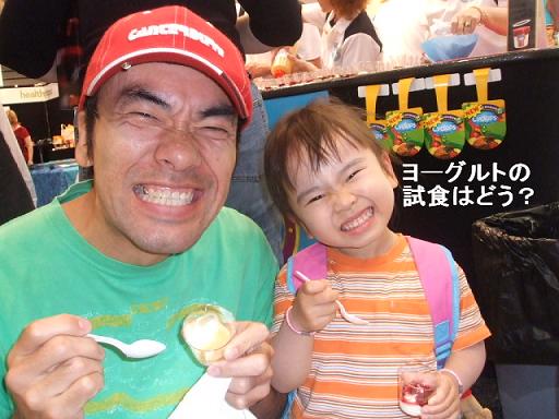 以前、「moja家のブログは食べ物ネタが多い!」と言われたことがありました。ごもっとも…。食い意地張ってますからねぇ、特にyomeが…そんな私達にとって、欠かすことの出来ないイベントが先日開催されました。「これに行かずしてどうする?」的なこのイベント、その名も…、Food Show (フードショー)です。---その名の通り、食べ物の祭典です!街のあちこちにポスターが貼ってあります。食い意地の張ったyomeは興味シンシンです!とはいえ、いまいちピンと来ないottoとyomeそういう時に、決まって電話をかける相手は…、当然寄田ご夫妻(笑)。電話をかけた時、なんとご夫妻はフードショーから帰宅したばかり。(なんたる偶然!)しかも、かなり食べて飲んであそばしたご様子(??)電話の声色がゲッソリしていたのは気のせい(笑)???寄田ご夫妻はかなり堪能された様子で、話を聞いていたら絶対に行きたくなったyome。オススメと激励(?)を頂き、早速moja家も会場に出向くことにしました。--このイベントは基本的に「試食」と「販売」がメインだそうです。入場料が15ドル(1300円くらい)なので、日本人の大好きな「元を取って帰る!」の適用率がかなり高くなりそうです!会場に入るとかなりの熱気、気合がイヤでも入ってきます!そんな中、ottoの冷静なアドバイス…、「腹がふくれるから水モノ(飲物)は後だ!」yomeがottoを改めて尊敬しなおしたのは言うまでもありません…。実はこの写真、食べ始めてからかなり時間が経過しています。鬼のように食べ、ひとまずお腹が落ち着いてから写真を取り始めました(笑)。食べて…、食べて…、飲んで、怒涛のごとく胃の中に!!!まさしくフードファイトを地で行くmoja家!!「写真を撮っても良い?」って言ったら、ハズカシそうにポーズを撮られちゃいました。本当は…、コレ(↑)を取りたかったんですけれどね(笑)。お茶目なお兄さん達でした!そんなお兄さん達にグミの試供品をもらいました。何度も並んで食べちゃいました…この会は試食と販売の会なので、販売の方は日頃よりも少しだけ値段が安いようです。我が家はちょうどジャムが切れたところなので、2つで5ドルのジャムを買いました。--途中komoはアイスクリームの販売を見つけてしまい、結局アイスを買って帰ることになりました。お家に帰って早速グミを開けると??気をつけないと、床についてしまう長さでした!--試食会にはたくさんのプラスティック皿やスプーンが出ました。ゴミにするのはなんとなくもったいなかったので…、その後komoは…、リサイクルして遊んでいます!