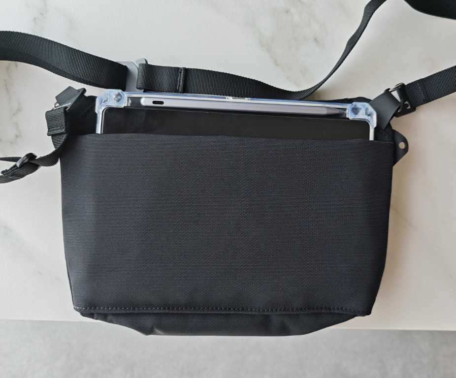 サイズ感:B6サイズがぴったり収まるコンパクトさ。スマホ、財布、鍵、イヤホンなど、日常の必需品がちょうど入る。