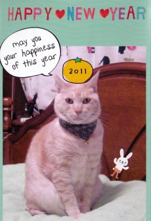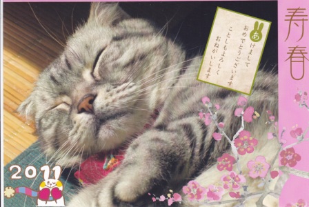 モカですママの作ってくれた僕の年賀状はもう一種類あるんだよそれは、これ 僕ね、なかなかおすましの写真がとれなくてママ困ってたんだよいっつも寝てるとこばっかりって でもね、ここママの枕の上だけどさ、やっとちゃんとカメラ目線出来たんだ って微妙にずれているな・・・・