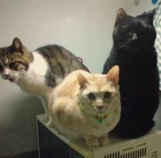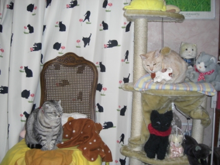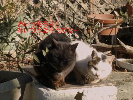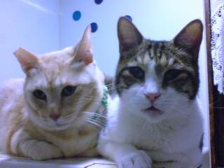 今日の紹介はゲン兄(元気)とくろ兄(くーにゃん) ぼくの後ろ、向かって左がゲン兄で右がくろ兄。 彼らは1階を居住区にしているメンバー。 ゲン兄は阪神大震災の時にボランティアさんの拠点だった「神戸元気村」で保護されて 一時預かりでママのとこへ来て、すっかりここがお気に入りになっちゃってママの子に なったんだって。 くろ兄は少し遅れて、保護されてやっぱりママの子になったんだよ ぼくははっきりわからないけど今5歳位かな。 お兄ちゃんたちはもう10歳をとうに超えているけどすごく元気。 時々追いかけっこもして遊んでくれるから楽しいんだよ。