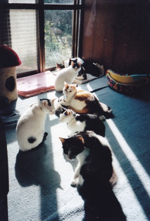 モカです今日は、ママがとても大切にしている写真を紹介するね僕がまだママのお家にいない頃、いやもしかしたらこの世に生まれていなかったかもしれない頃のある冬の日の光景ママの大切な家族たちの賑やかな日向ぼっこ 全部で何匹いるかな?手前から、BOY兄ちゃん、ひでき兄ちゃん、その左横BOY兄の妹てん子ちゃん(ひできのママ)、クッションの上のマル兄ちゃん、そしてBOY兄とてん子姉のママちゃん、外を見ているのがゲン兄ちゃんとくろ兄ちゃん総勢7匹、ここに参加していないけど、当時はこの前写真公開したMIKE兄ちゃんもいたんだ。ある冬の日の幸せな時間、ママの心の宝物なんだって。ゲン兄とくろ兄以外は、みんなもう虹の橋を渡って逝ったんだママは時々無性にみんなに会いたくなるんだって・・・ ママ、今は僕がそばにいるよ、寂しくなんかないよね! でも、いつかきっとまた会えるんだよね。ママも僕もみんなに会えるんだよ。そうしたら、また日向ぼっこしようね、今度はもっと沢山だからきっと楽しいよ。 だから、今は僕やまりあ姉ちゃんやゲン兄やくろ兄、そしてもっくん、星子さんとの時間を楽しんでね。 ファイト ママ・・・