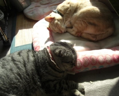 モカです今日は、ちょっと嬉しい出来事があったよ ほらね、まりあお姉ちゃんとこんなに近い距離で日向ぼっこ出来たんだよまりあお姉ちゃんは猫嫌いだから、僕いつもそばに行くと怒られちゃったりするんだけど時々は、こんな風にちかくにいても大丈夫になってきたんだ日が陰った後もね、ほら ママのベッドの上でいっしょにおねんね出来たんだ今日のちょっと嬉しい出来事でした ◎