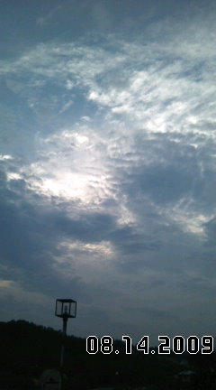 おとといから1泊で近場の旅館にプチ旅行してました。今回はのんびり~で、そして料理を楽しみに出かけました。ネトで予約してたんだけど、そこのホテルのHP上では写真とかPRがとても素敵でっ☆めちゃめちゃ期待しちゃうよー、そりゃあ~。でもいざ行ってみたら・・・・・微妙すぎる( ̄ω ̄;なんつか;;期待はずれもいいとこで。料理がとにかく写真と違う感じがするし、冷めたものばかりだし・・それに夜景が自慢のとこなのに、私達の部屋はいい眺めの思いっきり反対側の部屋で(どゆことっ!すごい損した気分になりましたorz←ショックが隠せないそして私ってば大浴場とかが苦手で、家族風呂がない時はいつも部屋の風呂に入るんですけど今回は部屋の風呂も超微妙だったので、人の少ない時間帯を狙って娘と大浴場いきましたっ☆このチンケな体を人前にさらすのは犯罪だし、何より自分自身が恥ずかし過ぎるっ!!んなもんで大浴場嫌いなんすけど;; 皆様ってばすんごい堂々と入ってらっしゃるのね!どこもかしこも隠されず、凄すぎるわっ(◎д◎;私の横のおばちゃんが立ちながら尻をもお~ってされた時に、ダイレクトに目に入ってきた日にはああぁぁぁぁ(●д●)ノーコメントで・・・ムリ、ムリだわ私っorz きっとすんごい婆ちゃんになるまでムリっぽい(何超久々の大浴場はヘンな汗まみれでしたわ。娘にも急がせて悪かった・・。次の日ちょっと離れたレジャー地に行く途中、あたりまえですが渋滞に巻き込まれ(´Д`)移動に4時間かかり、フェリーに乗ろうと思ってたのに次乗れるまで2時間半待ちだなんて。並ぶのがダメダメな我家族はそのまま特になにもせず帰って来ました。結局地元近くの公園で遊ばせて帰ってきて・・この時の空をパチリ。なんてことない空だけど見てるとセツナクなる(撮んなつかこの写真ってば携帯で撮ってたんですが、何故か日付がデカデカとっ!なんで(?д?) いつこの設定したか記憶喪失。さらに何しても消えねぇぇ☆どゆことっ;