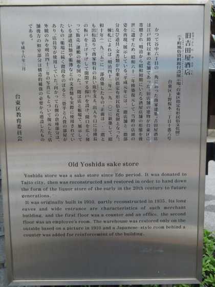台東区谷中6丁目で江戸時代から代々酒屋を営んでいた「吉田屋」の建物が移築され、酒類の販売に用いる道具や資料が展示されているそうです。